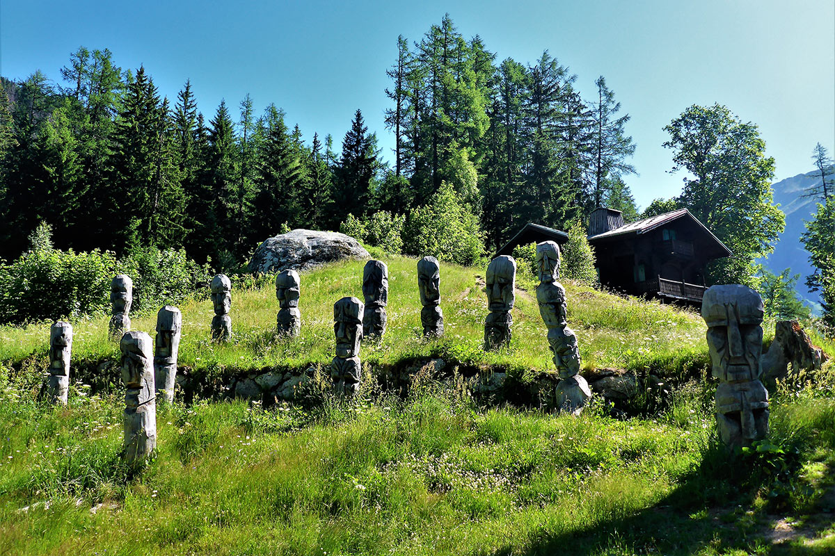 Rechts führt ein Pfad nach Tré le Champs, allerdings ohne „Tour du Mont Blanc“-Kennzeichen. Merkmal dieses Ortes sind die in Holzstämme geschnitzten Gesichter, die mitten in der Natur stehen – eine Armee von grimmig dreinschauenden Totempfählen.
