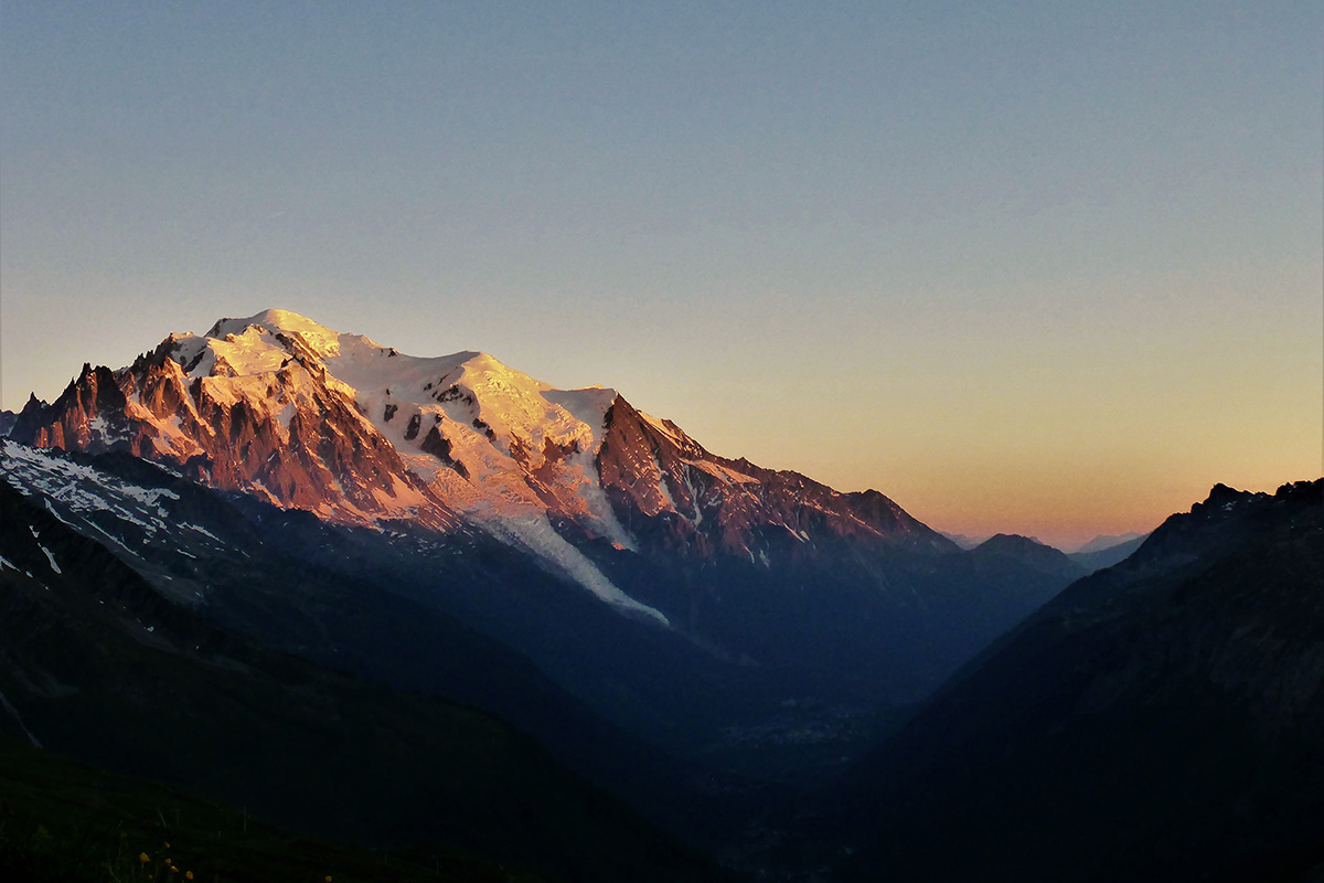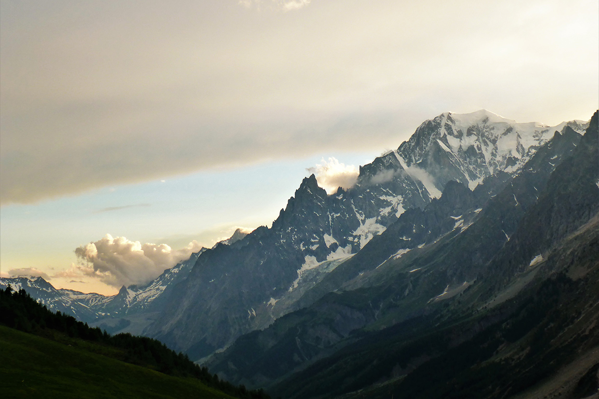 Auf der anderen Seite bieten sich Blicke sowohl auf den Kletter-Berg Dent Du Géant als auch auf den mehrgipfligen Les Grandes Jorasses. Und auf die weiße Spitze Europas, die sich schüchtern hinter einigen Schleierwolken versteckt. Ein Zeltplatz ist schnell gefunden, wenige hundert Meter nach dem Rifiogio Bonatti (2025 m), abseits des Weges. Kurz vor Sonnenuntergang öffne ich die Plane und blicke in den inzwischen wolkenlosen Himmel. Majestätisch thront der Mont Blanc am Horizont.