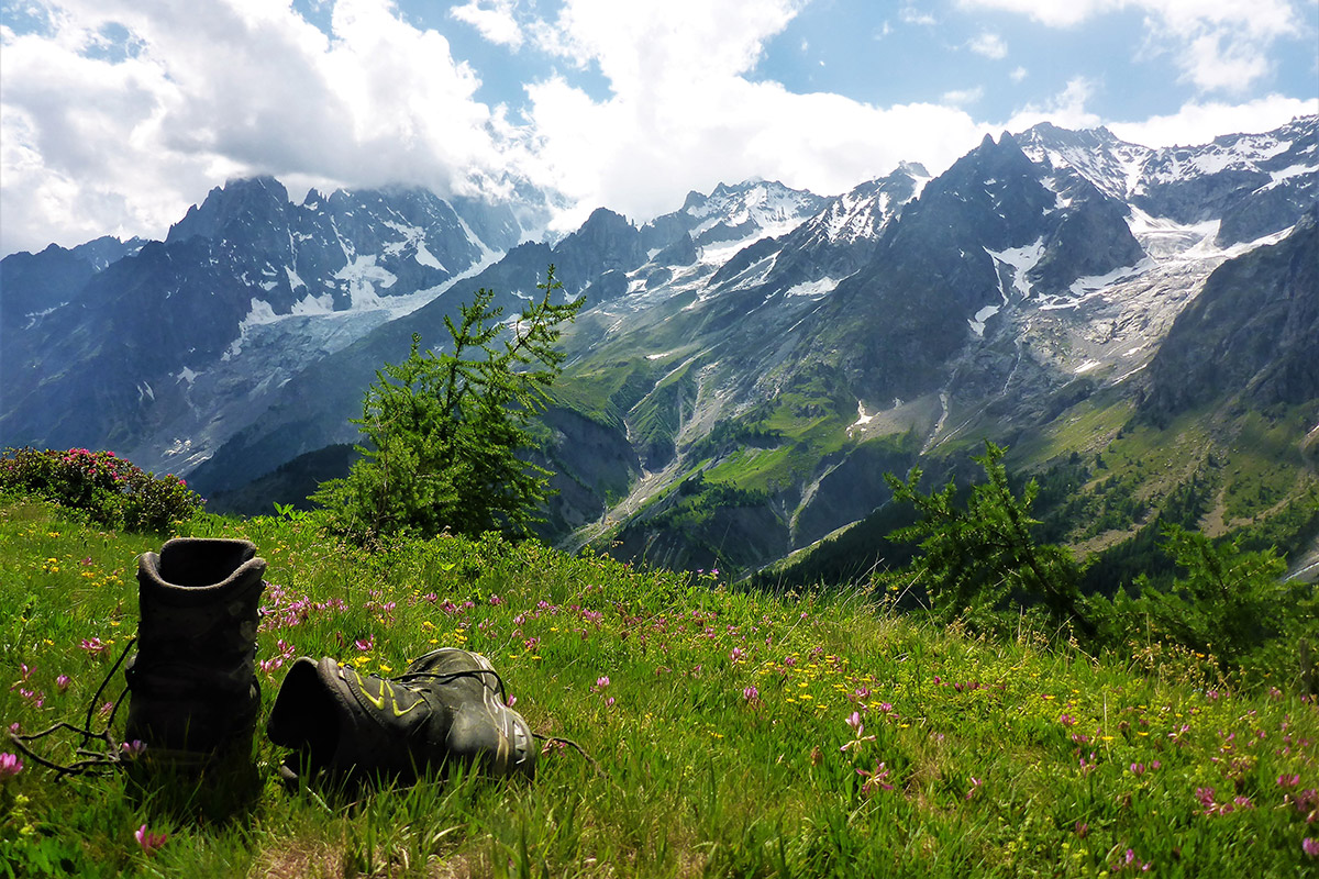 Chamonix, Frankreich: Knapp 10.000 Einwohner, Hotels in der Stadt und Zeltplätze im Nachbarort Les Bossons. Eine Information für Touristen, die eine grobe Karte der Rundwanderung Tour du Mont Blanc bereithält – ein ideales Basislager für den Trip. Ich nehme den Bus um 7.19 Uhr nach Les Houches, dem „üblichen“ Start. Keine drei Stunden und 600 schweißtreibende Höhenmeter später genieße ich die Aussicht vom ersten Bergpass, dem Col de Voza.