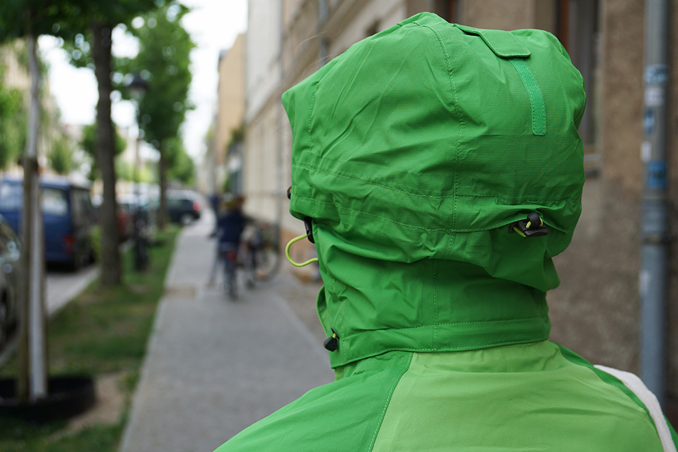 Hier kommen wir auch schon zu meinem ersten Einsatzbereich, dem Radfahren im Alltag. Ein großer Pluspunkt ist für mich, dass sich die dünne Kapuze problemlos unter einem Helm tragen lässt. Auch der Stehkragen ist angenehm hoch, mit Mikrofleece gefüttert und schützt damit den Halsbereich und das Kinn vor Wind.