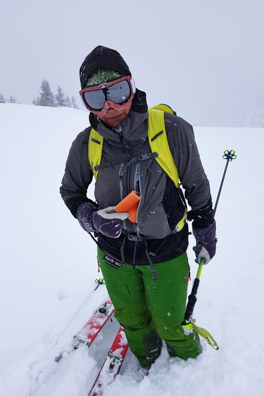 Umweltfreundlich & wasserdicht: Gerade der grüne Fußabdruck bei Herstellung und Produktion haben mich überzeugt, die umweltfreundliche Ceplex Green Membran einmal genauer unter die Lupe zu nehmen. Mit einer Wassersäule von mindestens 15.000 Millimeter ist die Regenjacke absolut wind- und wasserdicht. Getestet habe ich diese Fähigkeiten auf der ein- oder anderen doch recht stürmischen Skitour in Hochfügen, an meinem Hausberg (dem Rauhkopf am Spitzing) und am Kitzsteinhorn. Wind- und Schneegestöber hat sie gut ausgehalten, zudem war sie erstaunlicherweise wärmer als alle Hardshells, die ich normal im Einsatz habe. Das Innenfutter ist recht soft und angenehm zu tragen. Besonders hervorzuheben ist dabei der weiche Kinnschmeichler, auch genannt Kinnschutz.