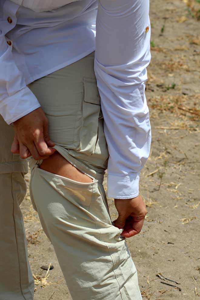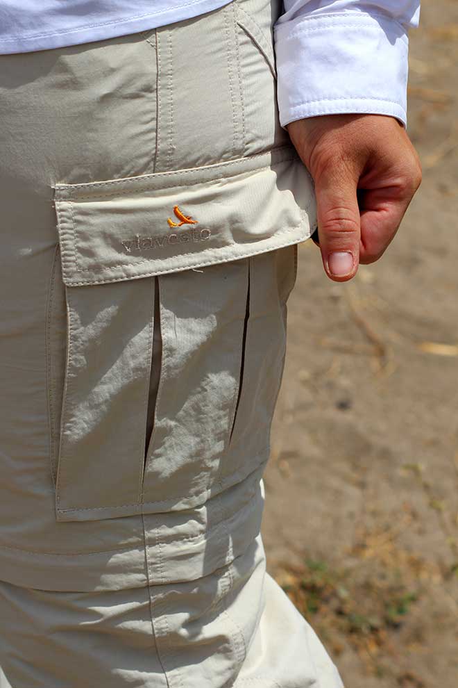 Was unsere anfängliche Sorge bezüglich des Materials betrifft, können wir potentielle Käufer beruhigen: Die Viavesto-Kleidung trägt sich angenehm leicht. Die eingearbeiteten Zwickel sorgen für einen perfekten Tragekomfort und genügend Bewegungsfreiheit. Dies ist auch nötig, wenn man drei Tage im Safari-Jeep mit offenem Verdeck steht, nach Tieren Ausschau hält oder bei den unebenen Straßen nach vorne und hinten geworfen wird. Vor allem der teilelastische Hosenbund mit Gürtelschlaufen garantiert, dass die Hose auch anständig sitzt. An dieser Stelle sei darauf hingewiesen, dass die Zip-Off-Funktion der Senhora Eanes Hose für warme und tropische Regionen wie Afrika unglaublich praktisch ist. Allerdings kann sie bei Menschen mit etwas breiteren Oberschenkeln etwas eng sitzen. Falls man sich bei den Größen also nicht ganz sicher ist, unser Tipp: Die Hose lieber eine Nummer größer bestellen!