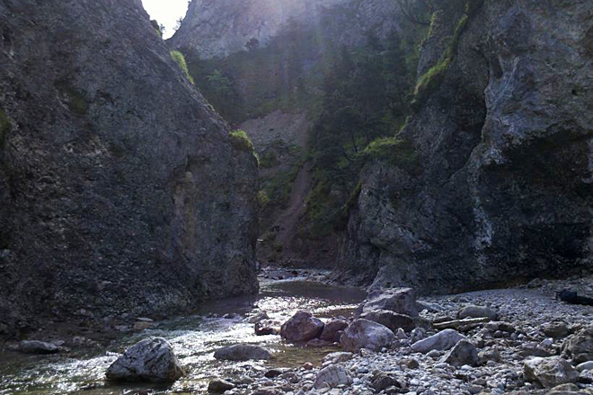 Schon nicht mehr recht Allgäu, ist das Gsperr dennoch ein wunderschönes Gebiet. Ein Bach mit glasklarem Gebirgswasser plätschert am Fuß der Wand vorbei, das Bachbett ist ein weiter Steinstrand, der sich völlig unvermittelt zu einer schmalen Schlucht verengt. Blickt man durch diesen Korridor, erheben sich dahinter hohe Gipfel. Ein wunderschöner Anblick.