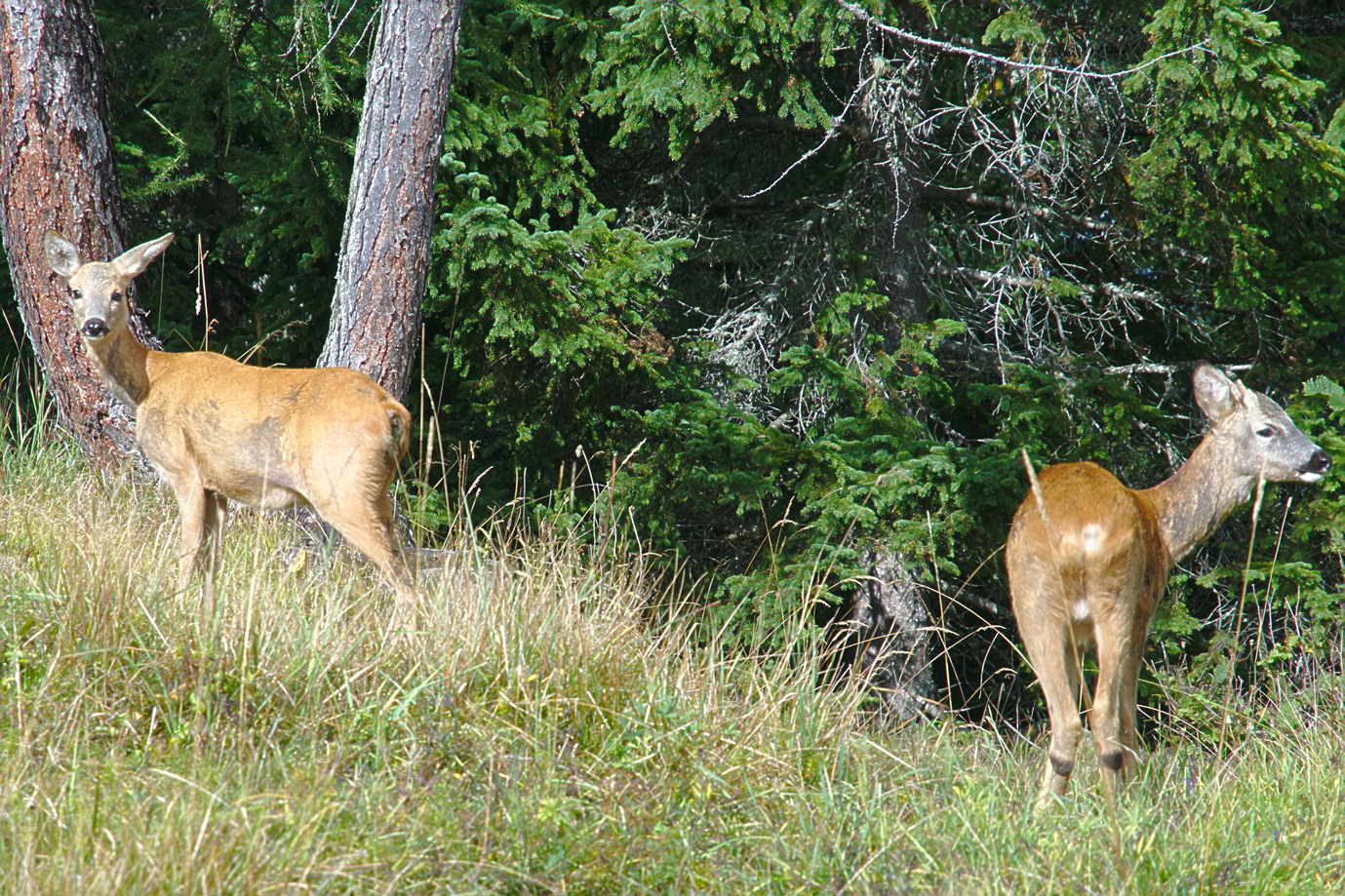 Links und rechts des schmalen Bergpfads zur Rifugio Mezzavia (Halbweghütte, 1.594 Meter) taucht hin und wieder ein Reh auf – auf einer Lichtung beobachten gleich zwei halbstarke Exemplare die vorüberziehenden Wanderer.