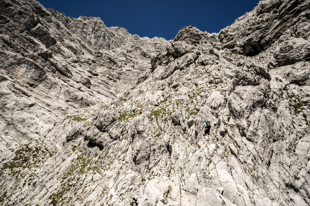 Die Übernachtung bringt am nächsten Tag den entscheidenden Zeitvorteil, sollte man nicht wie der aktuelle Rekordhalter Phillip Reiter im Jahr 2018 innerhalb von 1 Stunden und 52 Minuten durch die Wand sprinten wollen. In unserem Fall klingelt der Wecker um vier Uhr und wir sind pünktlich zum Sonnenaufgang an der Eiskapelle (830 Meter), dem am tiefsten gelegenen permanenten Schneefeld der Alpen und dem Einstieg zum „Berchtesgadener Weg“(max. 3+).