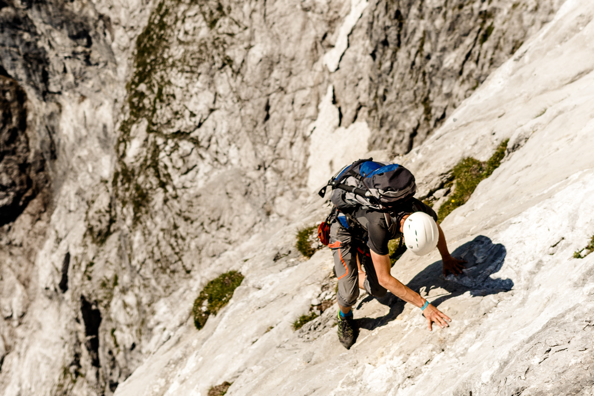 Nach der Schachtel geht es zunächst einige Meter nach rechts, dann nach links in eine brüchige Rinne und über zwei Steilstufen zum Einstieg der Ausstiegs-Kamine. Rrrrrrrrrssssssssshhhhh…klonk.. klonk.. – einige faustgroße Felsbrocken fliegen an uns vorbei. Ausweichen ist schlichtweg unmöglich. Ruhig bleiben, abwarten, hoffen. Alles gut! Es trifft keinen und wir können uns dem klettertechnisch schönsten Teil der Wand widmen.