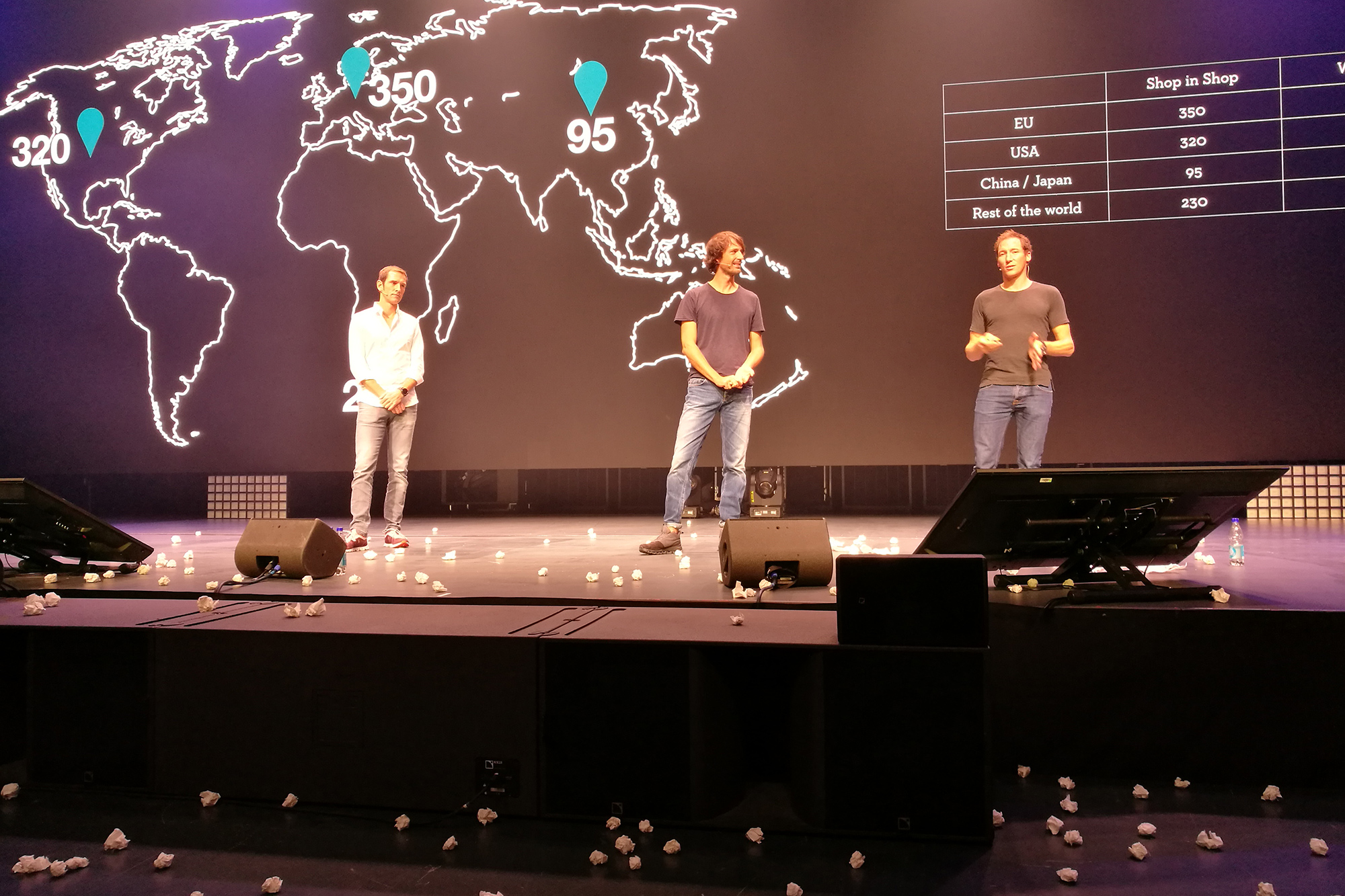 Im wirkungsvoll abgedunkelten Eingangsbereich werden uns Stirnlampen ausgehändigt – die Spannung steigt. Auf großer, mit Spotlights beleuchteter Bühne, hochgefahrener Sound-Anlage und großflächiger Video- Projektion geht es im Stile einer Rock-Show an den Start – wir sind beeindruckt! Gar nicht so unpassend, denn die sympathische Geschäftsführung mit den Gründungsmitgliedern Olivier Bernhard, David Allemann und Caspar Coppetti genießt schon ein wenig den Status von Stars in der On Szene und darüber hinaus. Entsprechend begeistert werden die Redner dann auch empfangen, die souverän, routiniert und natürlich in fließendem Englisch vortragen.