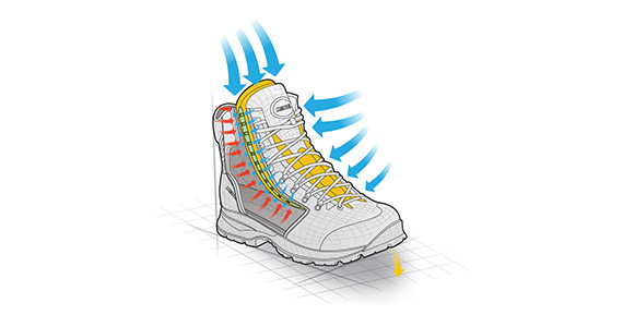 Der Schaftaufbau ist für eine optimale Dampfdurchlässigkeit so konstruiert, dass möglichst wenig Schaummaterialien verwendet werden bei gleichzeitig optimalem Tragekomfort
