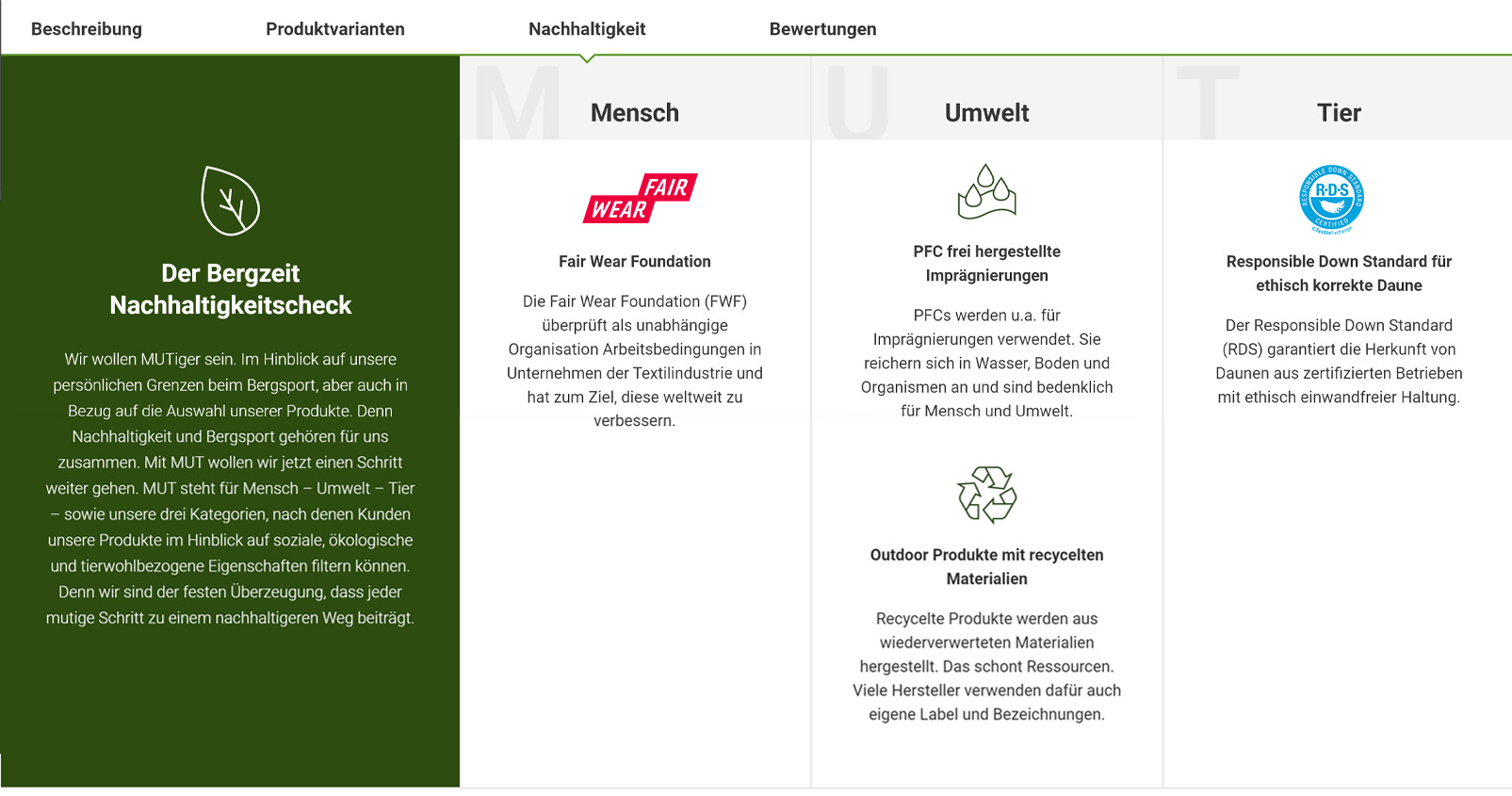 Wir bei Bergzeit haben unsere nachhaltigen Merkmale vorrangig an offiziellen Siegeln und Zertifikaten festgelegt. Diese lassen sich in die drei Kategorien Mensch, Umwelt und Tier einteilen. In der Kategorie Mensch werden soziale Faktoren im Herstellungsprozess betrachtet, so z.B. die Arbeitsbedingungen unter denen Produkte gefertigt wurden. In der Kategorie Umwelt werden alle ökologischen Faktoren betrachtet, die bei der Produktion eine Rolle spielen. Die letzte Kategorie Tier fasst alle Faktoren des Herstellungsprozesses zusammen, bei denen Tiere miteinbezogen werden, wie z.B. der Bezug von Wolle für die Produktion eines Pullovers.