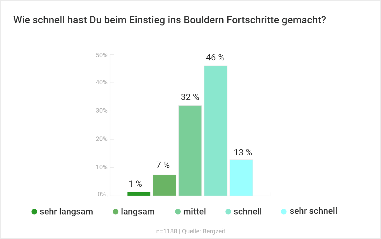 Unter den Teilnehmer*innen, die angaben, „schnell“ oder „sehr schnell“ Fortschritte beim Bouldern zu bemerken, war den Anteil der Männer in den Altersgruppen 18-25 sowie 26-35 am höchsten. Bei den Frauen haben vermehrt die 18- bis 25-Jährigen „sehr schnell“ Fortschritte beim Bouldern bemerkt.