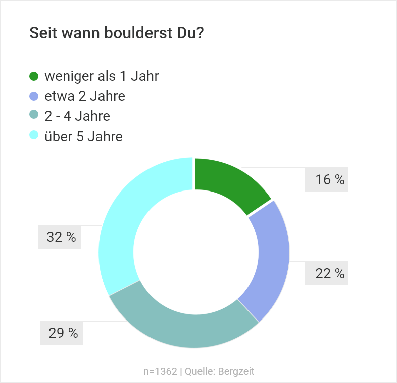 Bezogen auf ihre Erfahrung gaben knapp ein Drittel (32%) der Teilnehmer*innen an, seit mehr als fünf Jahren zu bouldern. Unter ihnen befanden sich hauptsächlich Sportler*innen, die zuvor angaben, neben dem Bouldern auch seilklettern zu gehen.