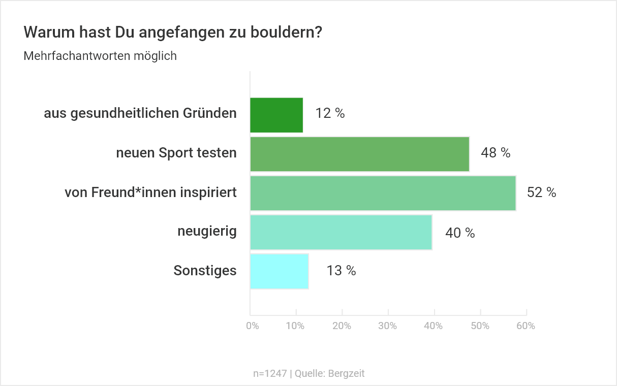 Auf die Frage, wie sie zum Bouldern gekommen sind, antworteten knapp 52% der Befragten, dass sie über Freund*innen zum ersten Mal mit der Sportart in Kontakt kamen. Auch der Faktor Neugierde und der Wunsch, eine neue Sportart auszuprobieren, hat viele Teilnehmer*innen dazu bewegt, mit dem Bouldern anzufangen.