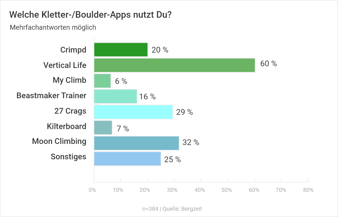 Als beliebteste App war Vertical Life mit 60% alters- und geschlechtsunabhängiger Favorit. Crimpd ist bei Männern sowie generell bei den drei jüngeren Altergruppen von 18-45 beliebt.
