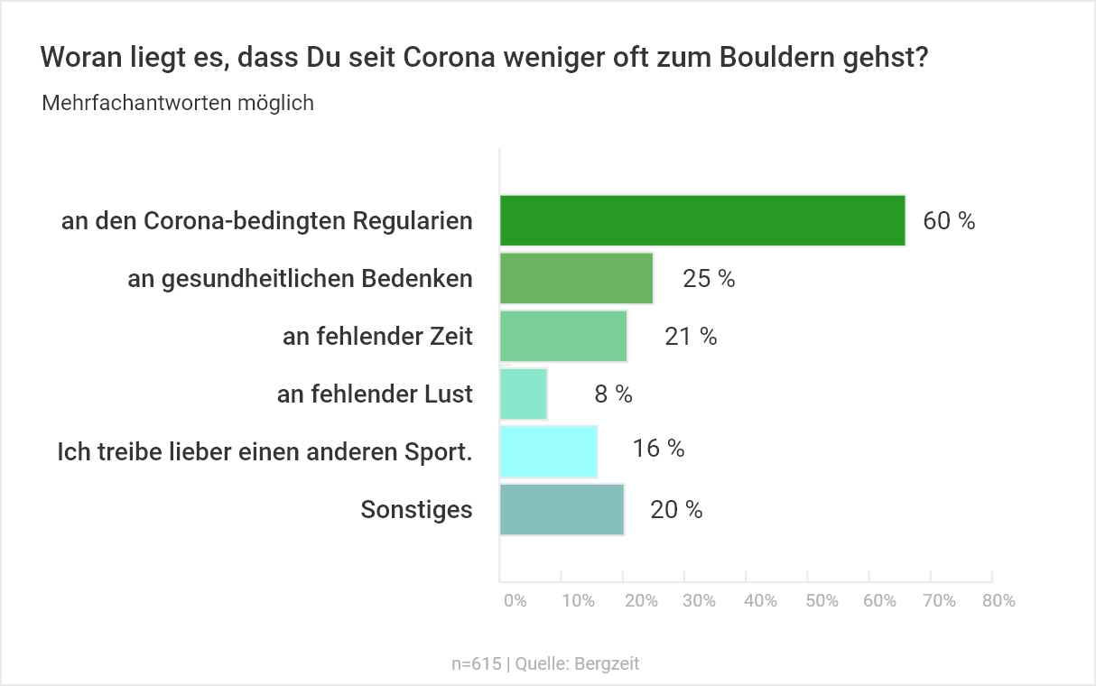Abgesehen von der Tatsache, dass die Kletter- & Boulderhallen über mehrere Wochen schließen mussten und in dieser Zeit kein Besuch möglich war, gibt ein Viertel der Boulder*innen, die seit Corona weniger oft in die Halle gehen, „gesundheitliche Bedenken“ als einen der Hauptgründe für ihre Entscheidung an. Auch spielen zeitliche Engpässe und fehlende Lust bei knapp 30% der Befragten eine Rolle. Dabei waren jeweils keine nennenswerten geschlechtsspezifischen Unterschiede zu erkennen.