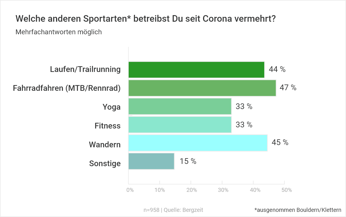 Bezogen auf die Sportarten haben Fahrradfahren (MTB & Rennrad), Wandern sowie Laufen bzw. Trailrunning geschlechterunabhängig stark an Beliebtheit gewonnen. Über 40% der Boulder*innen gaben jeweils an, diese Sportarten seit Corona vermehrt zu betreiben.