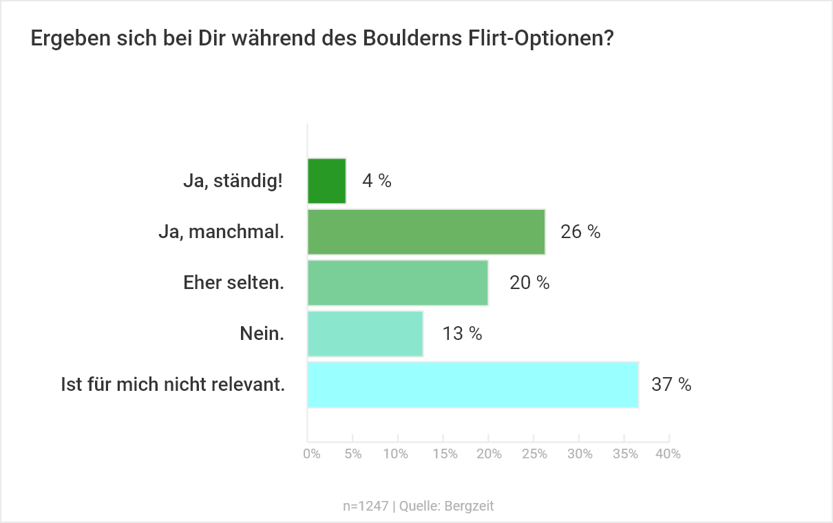 30% der Befragten gaben an, dass sich bei ihnen „ständig“ oder „manchmal“ Flirts beim Bouldern ergeben. Hier stellen vor allem Männer der Altersgruppe 26-35 den größten Anteil dar. Für Frauen ist der Dating- & Flirtaspekt beim Bouldern – unabhängig von der Altersgruppe betrachtet – durchschnittlich irrelevanter.