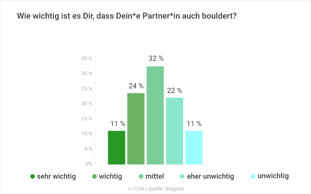 Für knapp 35% ist es „wichtig“ bis „sehr wichtig“, dass der Partner ebenfalls gern bouldert und beide damit ein gemeinsames Hobby haben. Dabei gaben über 50% mehr Frauen als Männer an, es als „sehr wichtig“ zu empfinden, dass ihr Partner dieses Hobby mit ihnen teilt.