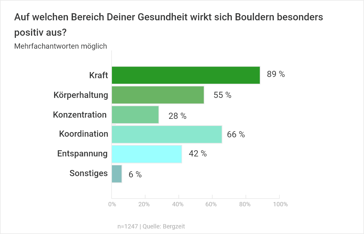 Neben den sozialen Reizen hat Bouldern auch auf die Gesundheit positive Auswirkungen. So haben sich Kraft, Koordination und Körperhaltung bei der überwiegenden Mehrheit der Umfrage-Teilnehmer*innen durch das Bouldern verbessert. Zudem haben knapp 42% angegeben, dass Bouldern zu ihrer Entspannung beigeträgt und 28% stellen eine verbesserte Konzentrationsfähigkeit bei sich fest. Bei allen Antworten gab es keine nennenswerten geschlechts- oder altersspezifischen Unterschiede.