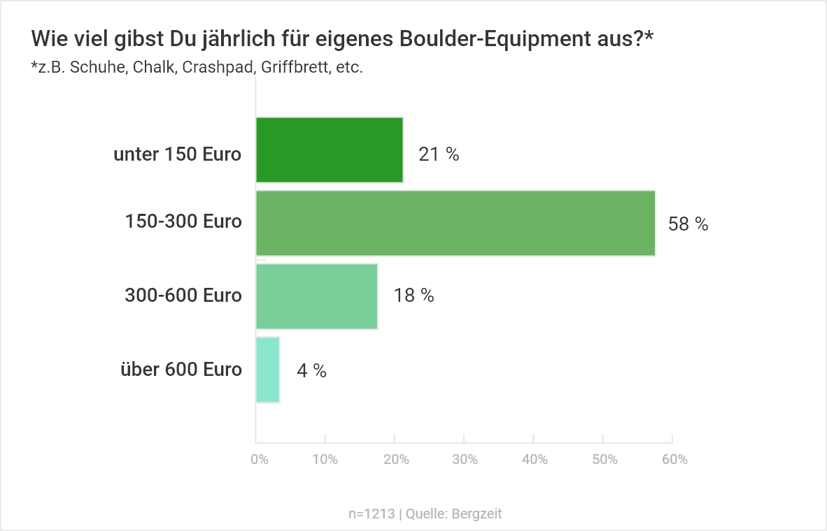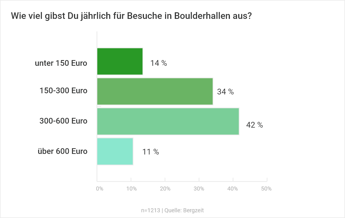 42% der Befragten gaben an, dass sie für Besuche in Boulderhallen 300 bis 600 Euro im Jahr ausgeben. 11% geben über 600 Euro aus.