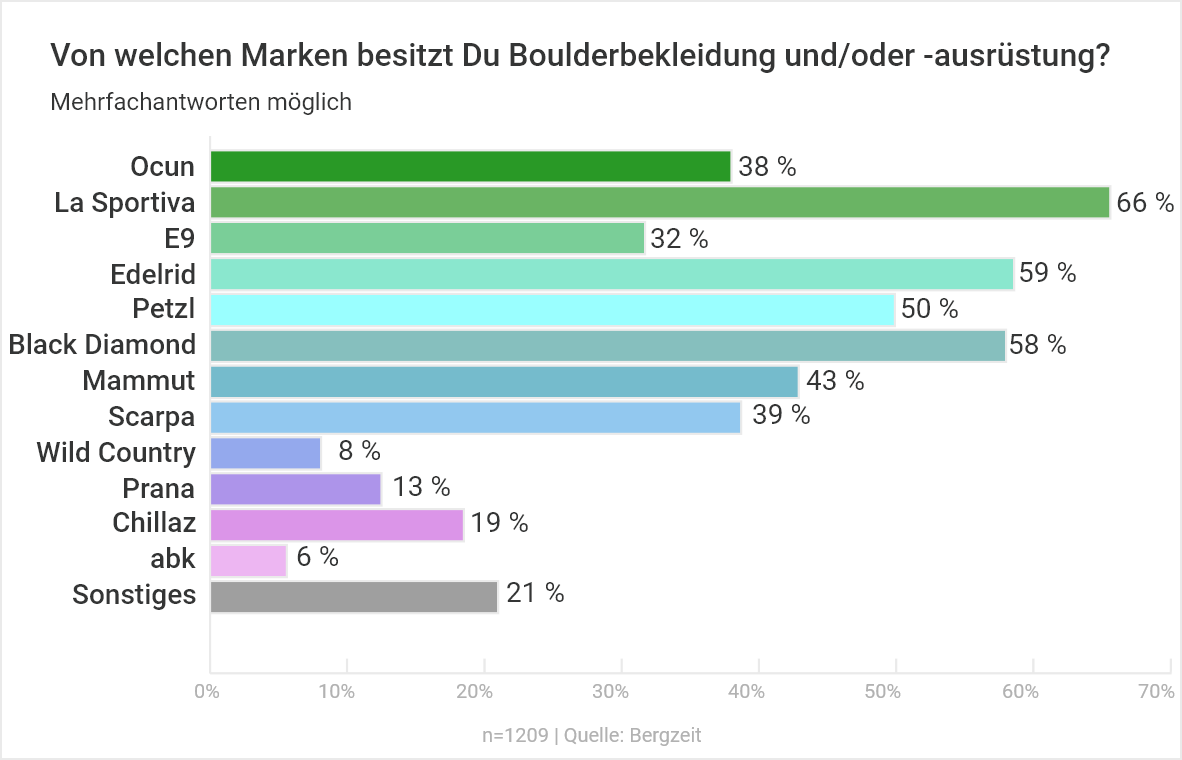 La Sportiva (66%), Edelrid (59%) und Black Diamond (58%) positionieren sich altersunabhängig unter die Top 3 der verbreitetsten Marken. Edelrid und La Sportiva weisen keine nennenswerte geschlechtsspezifische Tendenz auf. Dagegen zeigten die Ergebnisse der Umfrage, dass Black Diamond stärker bei Männern verbreitet ist.
