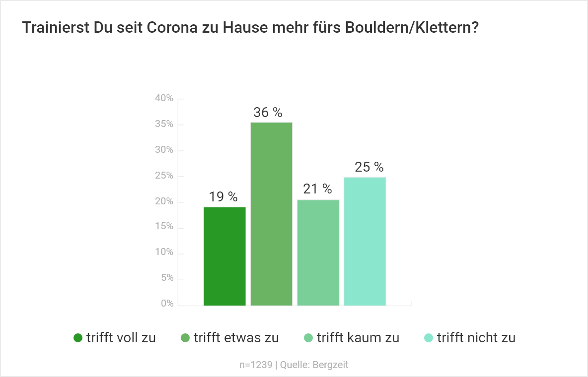 Rund 43% der Befragten gaben an seit den Corona-bedingten Einschränkungen noch genauso regelmäßig bouldern wie vor dem Ausbruch der Pandemie.