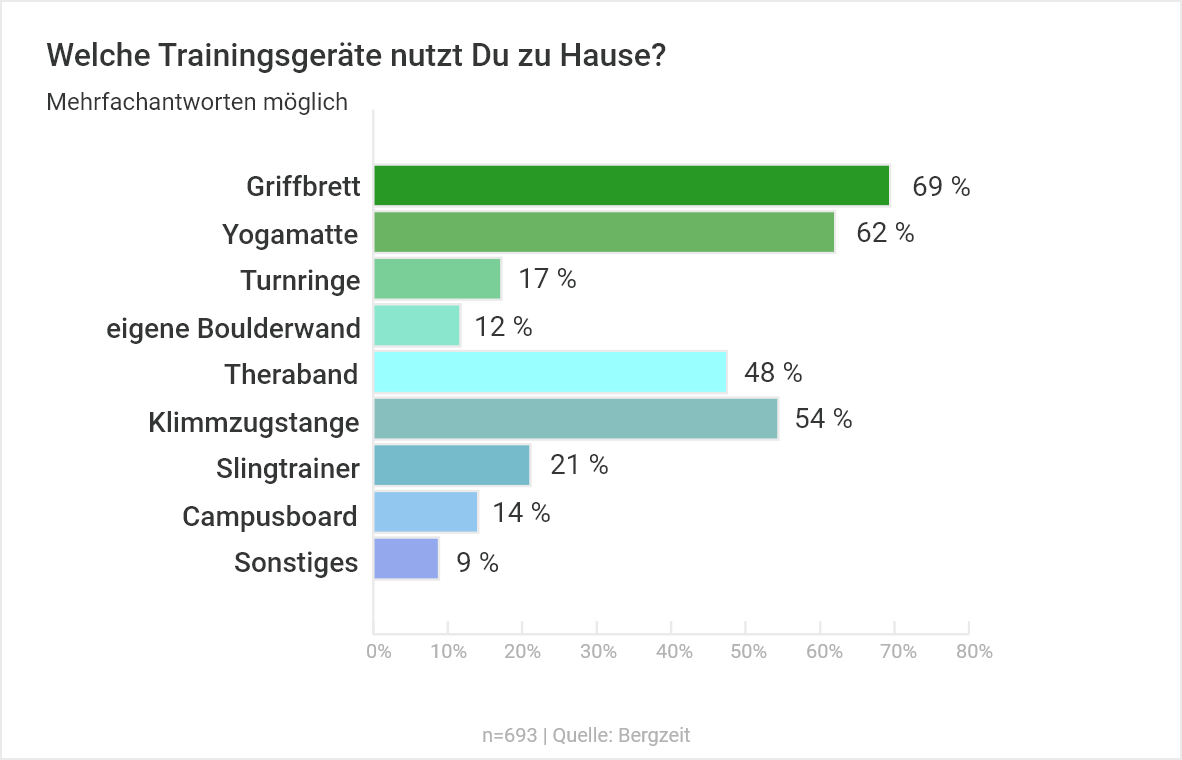 Über die Hälfte der Befragten (56%) gaben an, dass sie ergänzend zum Bouldern in der Halle oder am Fels zu Hause mit Trainingsgeräten arbeiten. Hier stellen Männer im Alter von 26 bis 35 Jahren die Spitzenreiter dar. Frauen nutzen zu Hause im Durchschnitt über alle Altersgruppen hinweg seltener Trainingsgeräte als Männer.