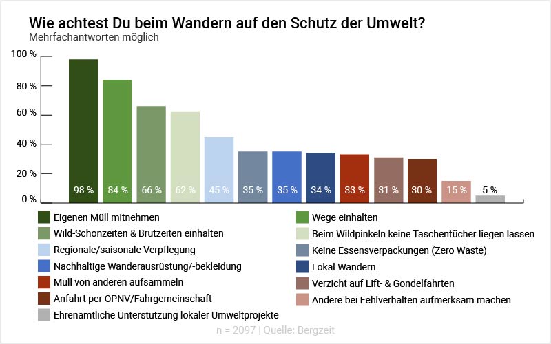 Wie auch im Vorjahr nehmen fast alle Wandernden ihren eigenen Müll, der auf Tour anfällt, wieder mit. Auch die vorgegebenen Wege einzuhalten, ist für die meisten selbstverständlich. Immerhin zwei Drittel der Befragten halten außerdem die Wild-Schonzeiten und Brutzeiten ein, während 62 % ihr benutztes Toilettenpapier wieder einsammeln.