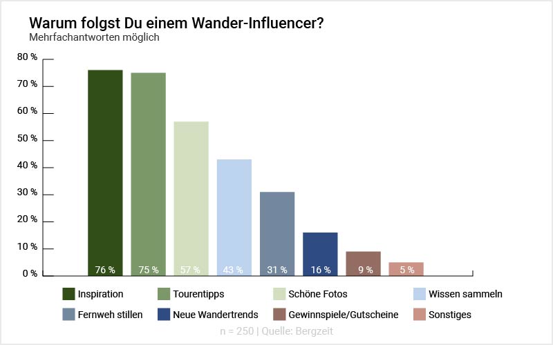 Ähnlich wie im Vorjahr folgt die große Mehrheit der Umfrageteilnehmer Wander-Influencern, um sich inspirieren zu lassen. In diesem Jahr geht es den meisten jedoch nicht nur um schöne Fotos (57 %), sondern insbesondere um konkrete Tourentipps – diese Art der Tourenplanung bzw. Ideensammlung konnte im Vergleich zum Vorjahr um stolze 11 % zulegen.