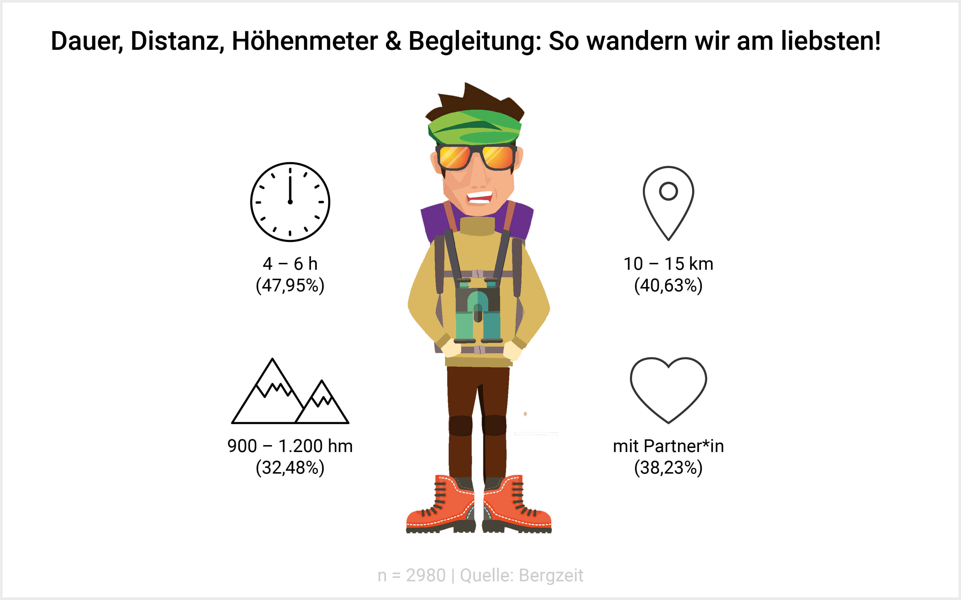 Wenn es darum geht, wie weit, lang, hoch und mit wem wir beim Wandern am liebsten unterwegs sind, zeichnen den Durchschnittswandernden folgende Merkmale aus: