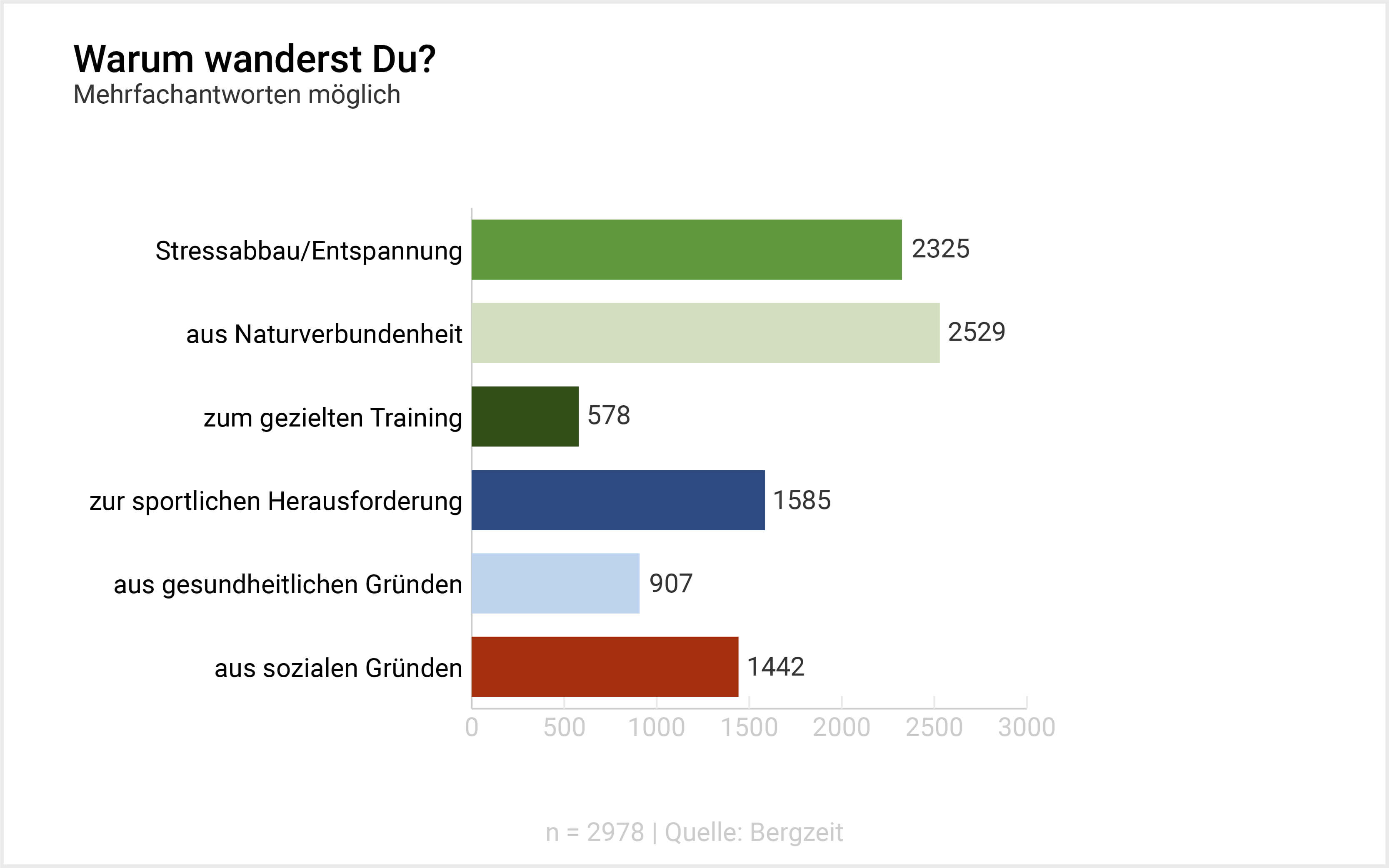 Wandern ist zwar Sport aber bei einem sind sich alle einig: Primär wird gewandert, um sich mit der Natur verbunden zu fühlen (85 %) und um Stress abzubauen (78 %). Doch auch die sportliche Herausforderung ist den Wandernden wichtig (53 %) – darunter vor allen Dingen den Frauen (54 %). Gezielter fürs Training nutzen es vor allem Männer: Jeder Fünfte trainiert auf Wanderungen gezielt seine Ausdauer.