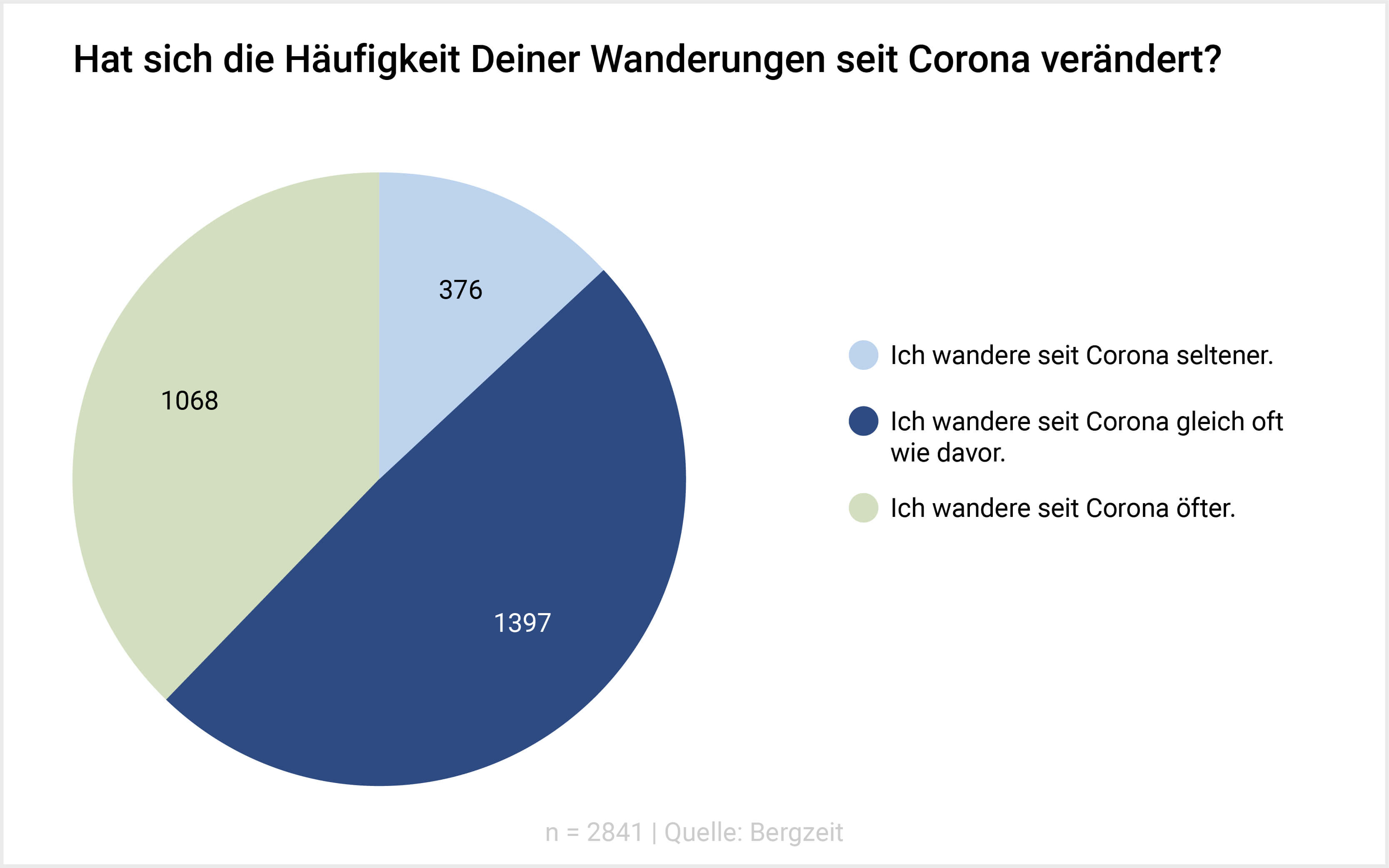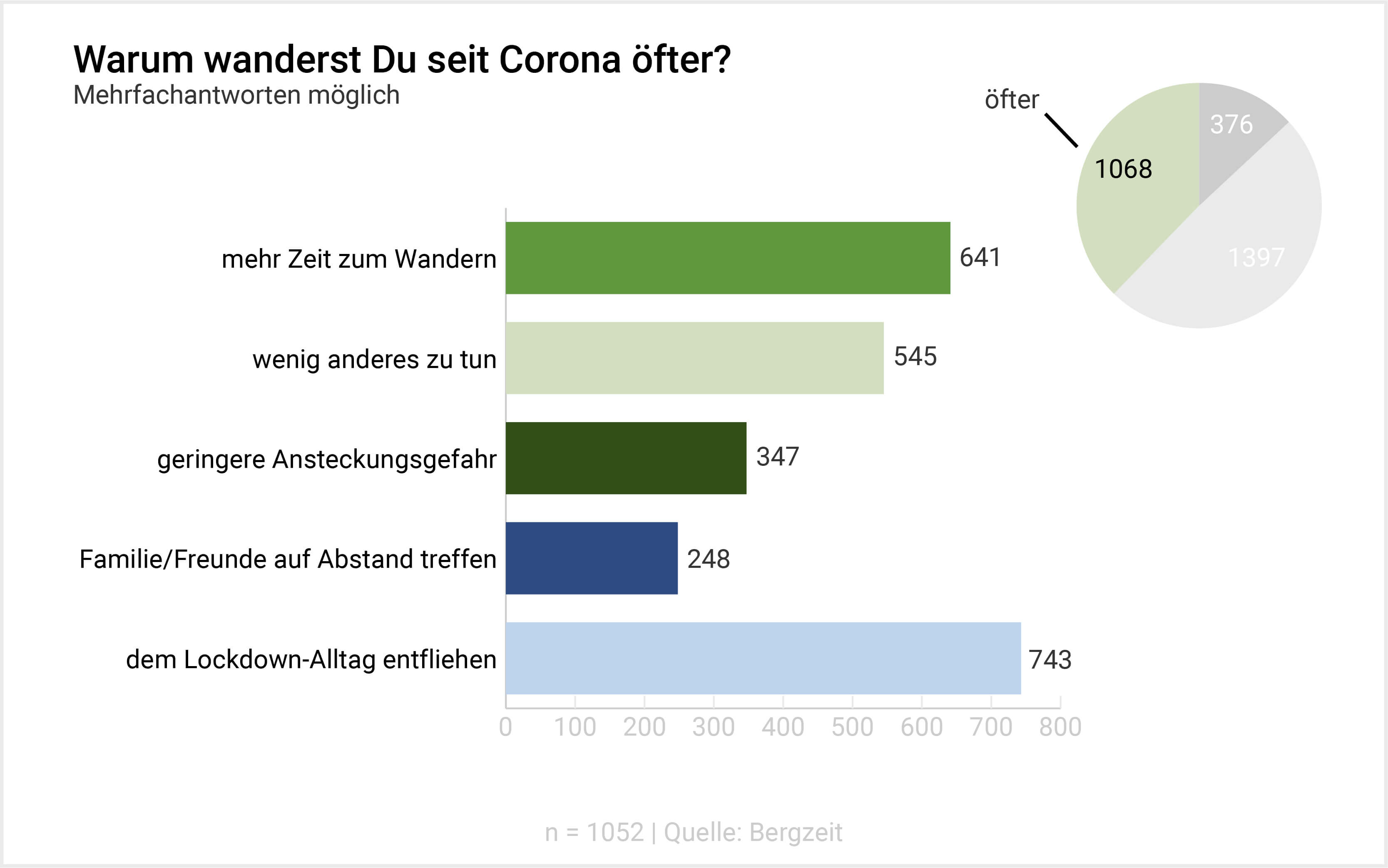 Wo auf der einen Seite zu wenig Zeit ist, steht auf der anderen Seite mehr Zeit zur Verfügung: 60 % der Befragten, die seit Corona öfter wandern gehen, haben schlichtweg mehr Zeit, um sich in die Natur zu begeben.