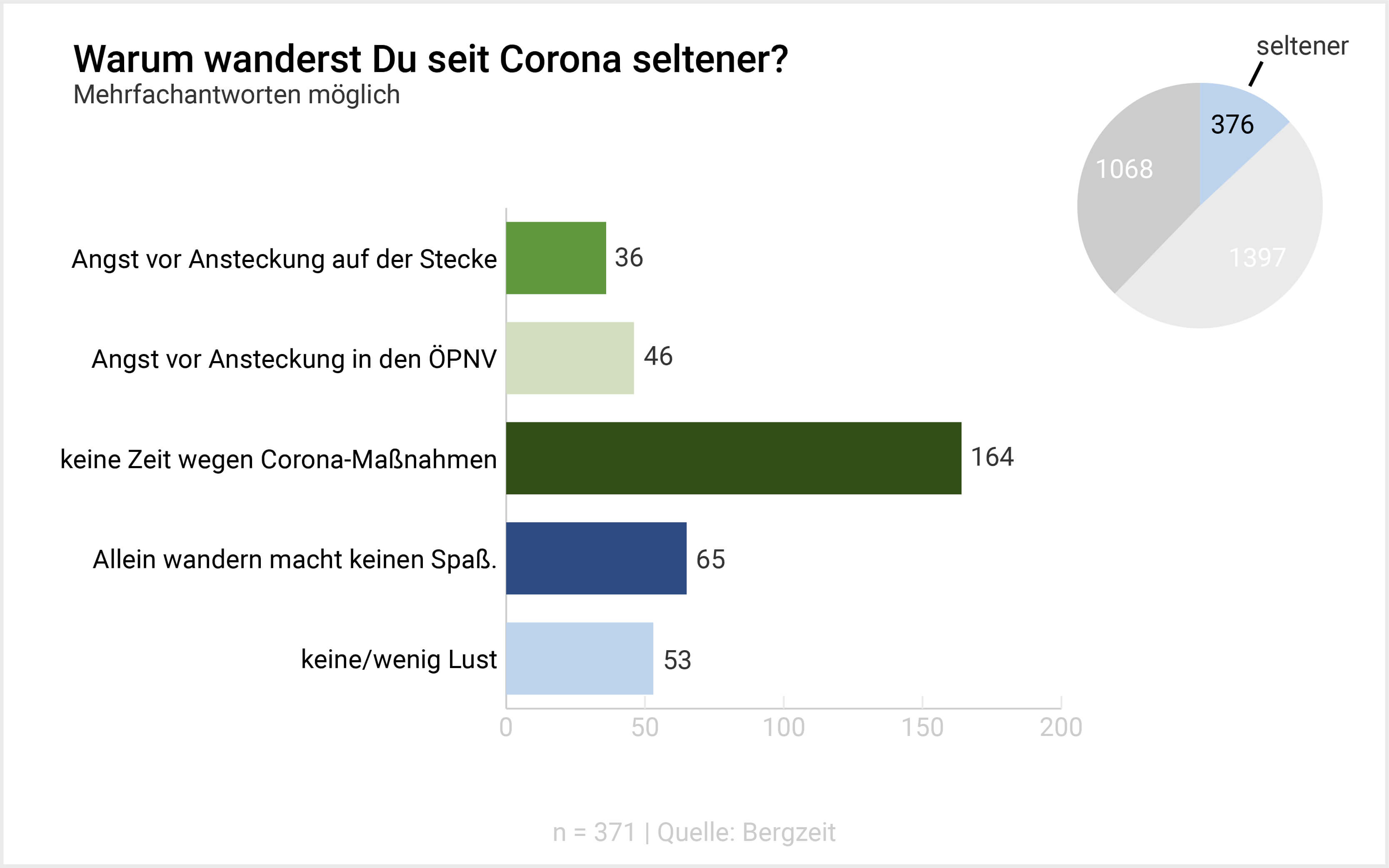 Dass Wandern eine große soziale Komponente hat, ist für 17 % ein Grund, seit den Corona-Beschränkungen seltener wandern zu gehen. Sie wandern lieber in Gesellschaft und haben daher wenig Interesse, allein den Wanderrucksack zu packen. Auch die allgemeine Lust oder Freude am Wandern ist laut eigenen Angaben bei 14 % der Befragten verflogen.