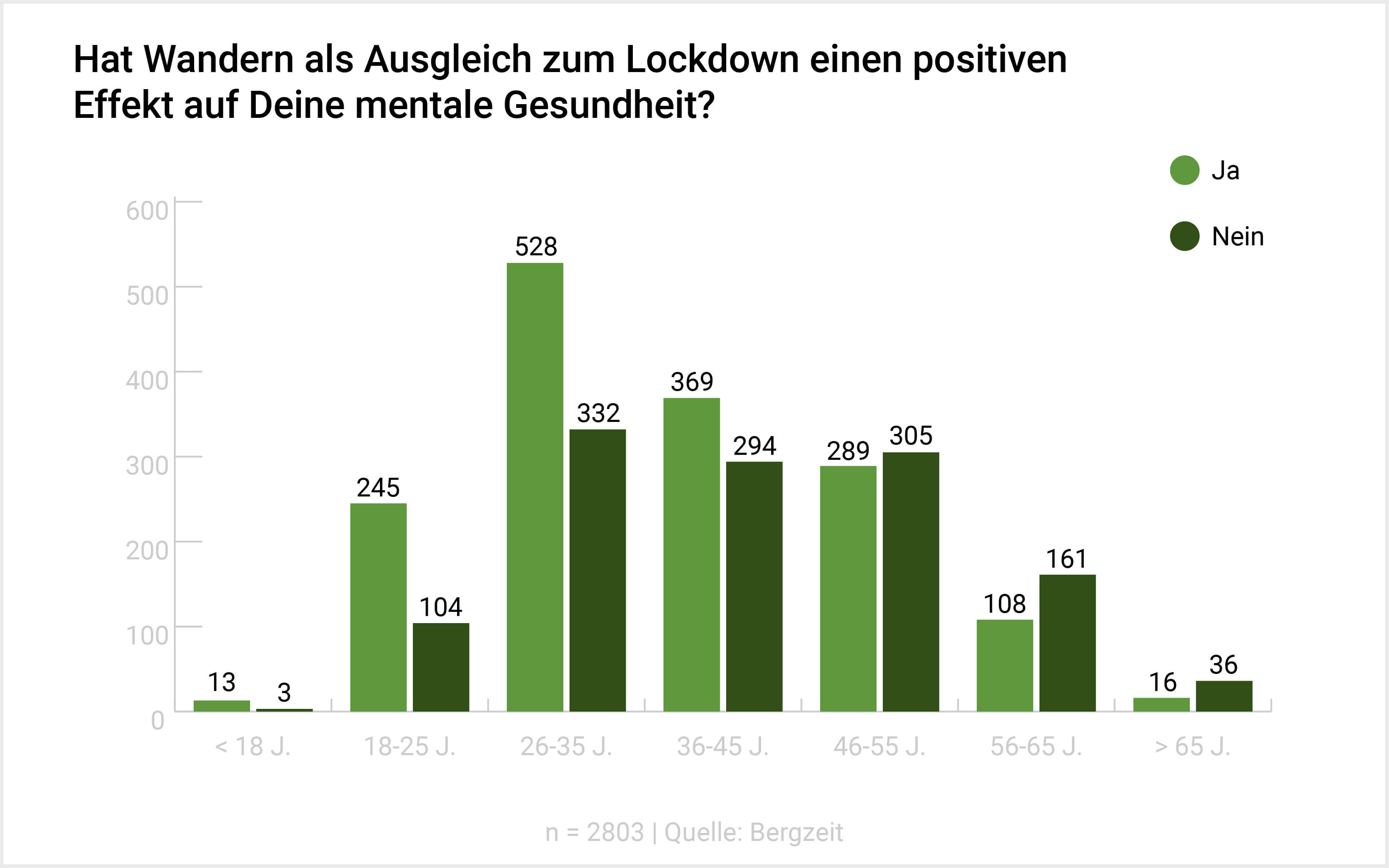 Für 56 % der Befragten ist Wandern eine Flucht aus dem Lockdown-Alltag und hat einen positiven Effekt auf ihre mentale Gesundheit. Für 44 % hat sich nichts verändert. Deutlich wird, dass besonders jüngere Generationen Wandern als Ausgleich während Corona brauchen. Die Zahlen sind im Vergleich zu älteren Generationen deutlich höher: