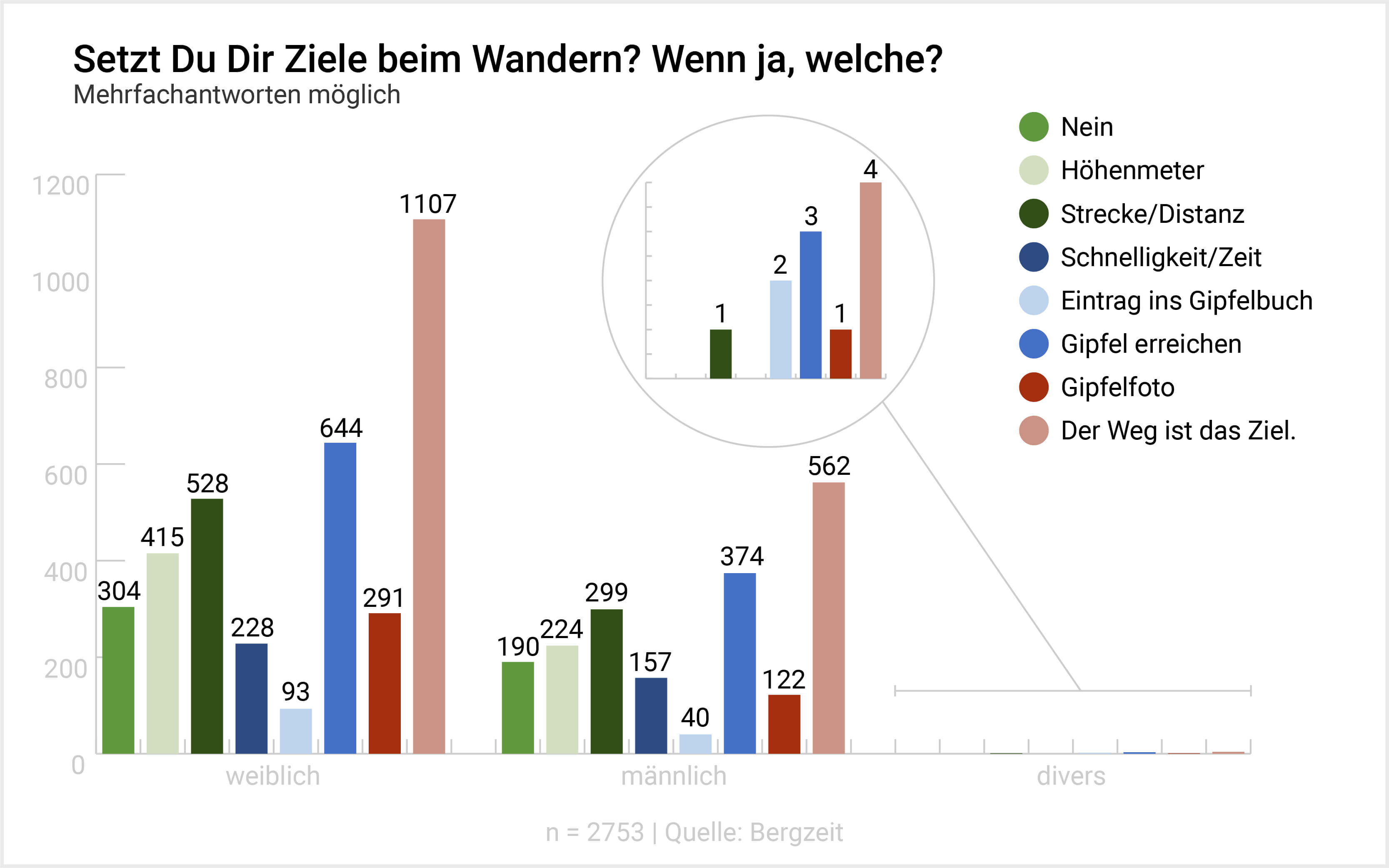 Geschlechter- und altersübergreifend (ausgenommen die Gruppe 18 bis 25 Jahre) sind wir primär Genuss- statt ambitionierte Sportwanderer. Wichtigstes Ziel bei 60,7 % aller Wandernden ist: der Weg! Allerdings folgen auf Platz 2 bis 4 bereits die sportlichen Ziele den Gipfel zu erreichen (37,1 %), Strecke/Distanz (30 %) und Höhenmeter (23,2 %). Prio 1 liegt für die 18 bis 25-Jährigen eindeutig beim Erreichen des Gipfels, gefolgt von „der Weg ist das Ziel“ und einer bestimmten Anzahl an Höhenmetern. Die Frauen dieser Altersgruppe legen zudem mehr Wert auf das Gipfelfoto. Die Gruppe Divers hat die Verewigung im Gipfelbuch an Platz 3 genannt.
