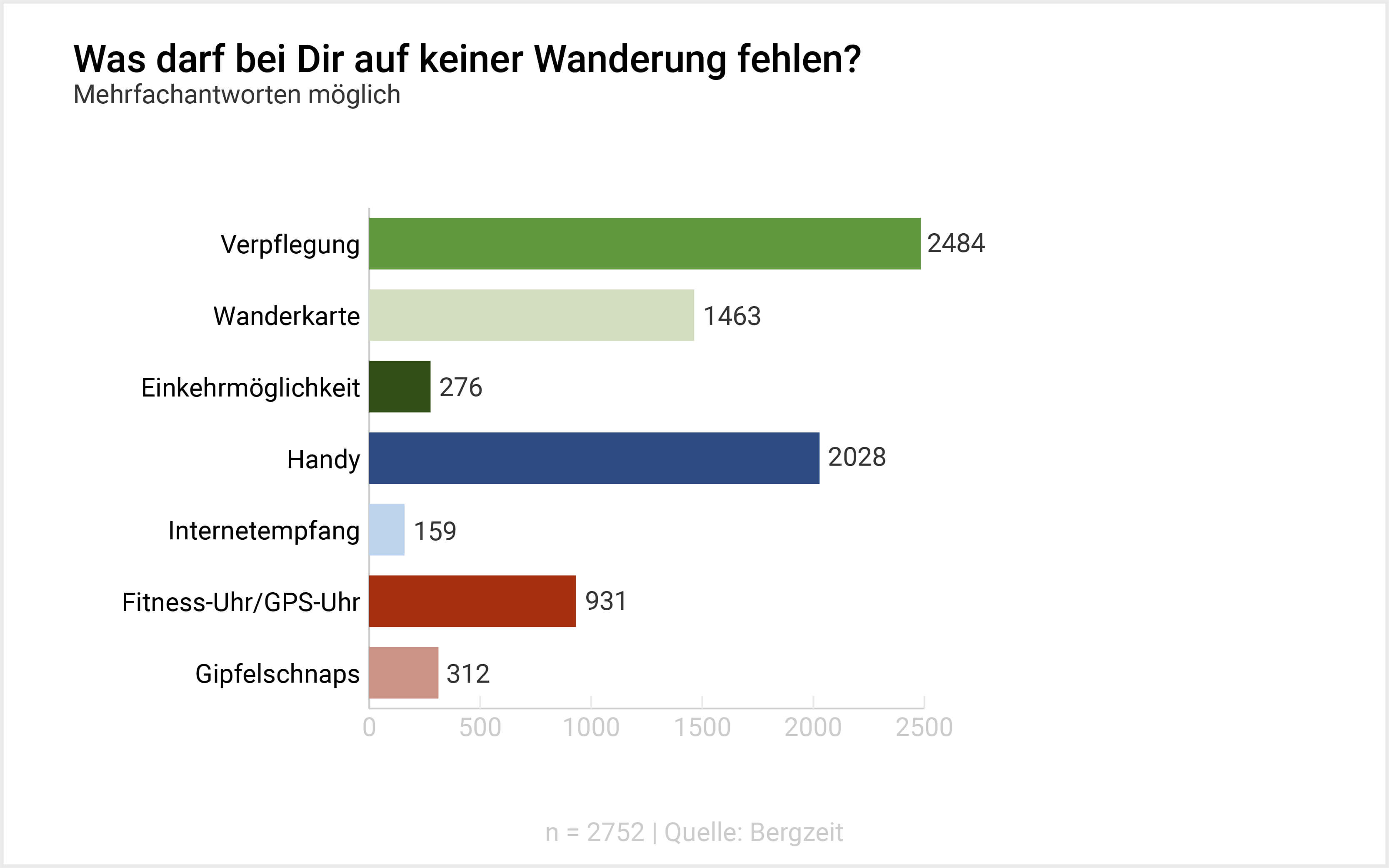 Geschlechter- und altersübergreifend wurde neben der obligatorischen Verpflegung in Form von Essen und Trinken das Handy als absolutes Must-Have bei jeder Wanderung genannt (73 %). Mit einer Wanderkarte in digital oder print sichern sich über 50 % der Wandernden zusätzlich ab.