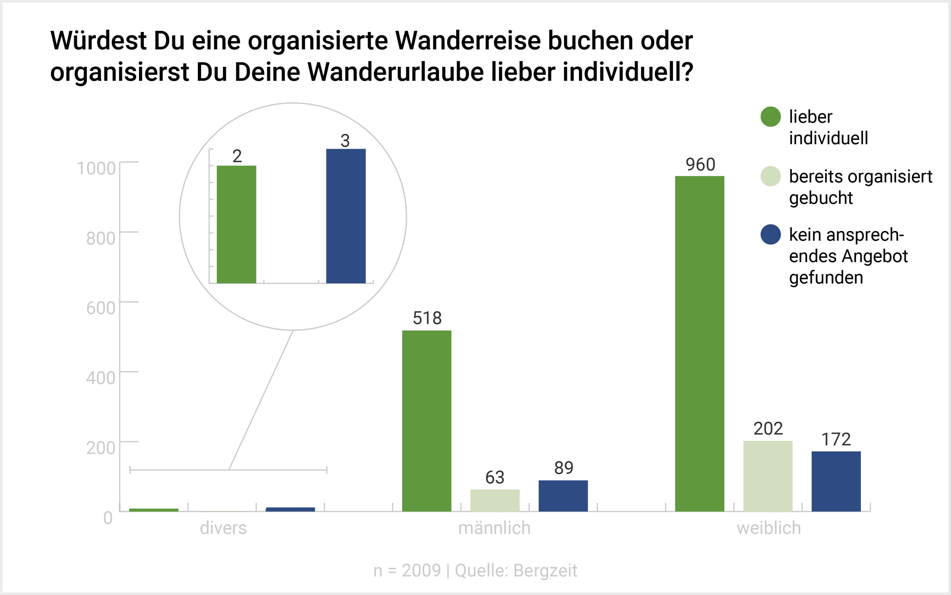Ein Mangel an geeigneten Angeboten, jedoch grundsätzliches Interesse haben vor allem Männer über 65 Jahren (20 %). Tatsächlich interessieren sich aber auch die jüngeren Generationen für Wanderurlaube: So gaben Männer zwischen 26 und 35 Jahren (15,8 %) sowie Frauen zwischen 18 und 25 Jahren (15,1 %) an, generell Interesse an organisierten Wanderreisen zu haben, nur bisher am geeigneten Anbieter gescheitert zu sein.