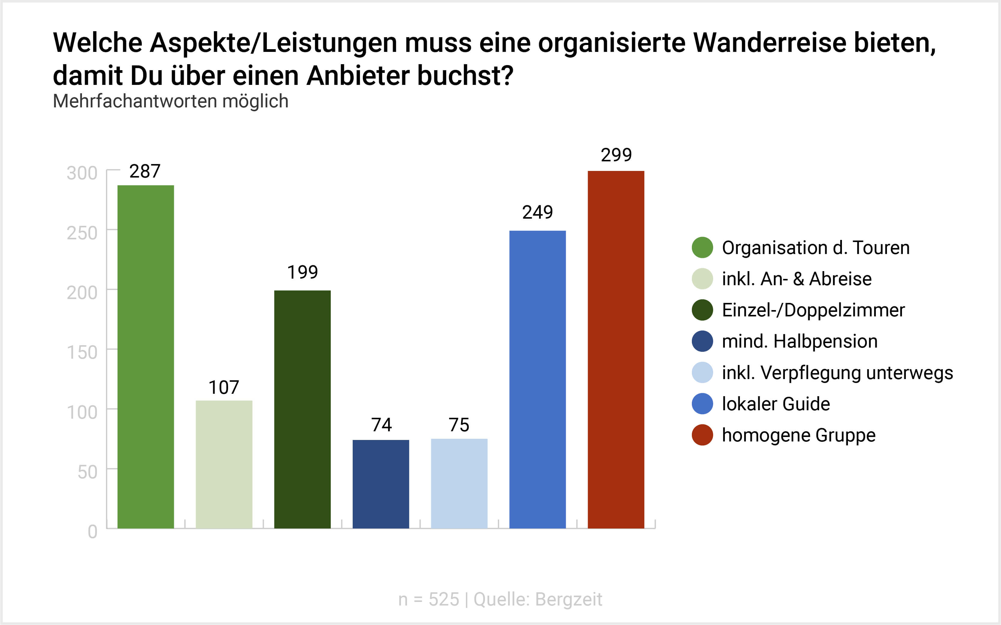Wer bereits organisierte Wanderurlaube gebucht hat oder grundsätzlich daran interessiert ist, dem sind vor allem eine möglichst homogene Gruppe (56,9 %), was z.B. Alter und Leistungsniveau angeht, wichtig. Getreu dem Motto „Gleich und gleich gesellt sich gern.“ Auf Platz 2 folgt die Organisation der Touren vor Ort (54,6 %) sowie auf Platz 3 ein lokaler Guide (47,4 %). Die letzten beiden Punkte stechen vor allem bei den jüngeren Umfrage-Teilnehmer*innen im Alter von 18-25 Jahren hervor.