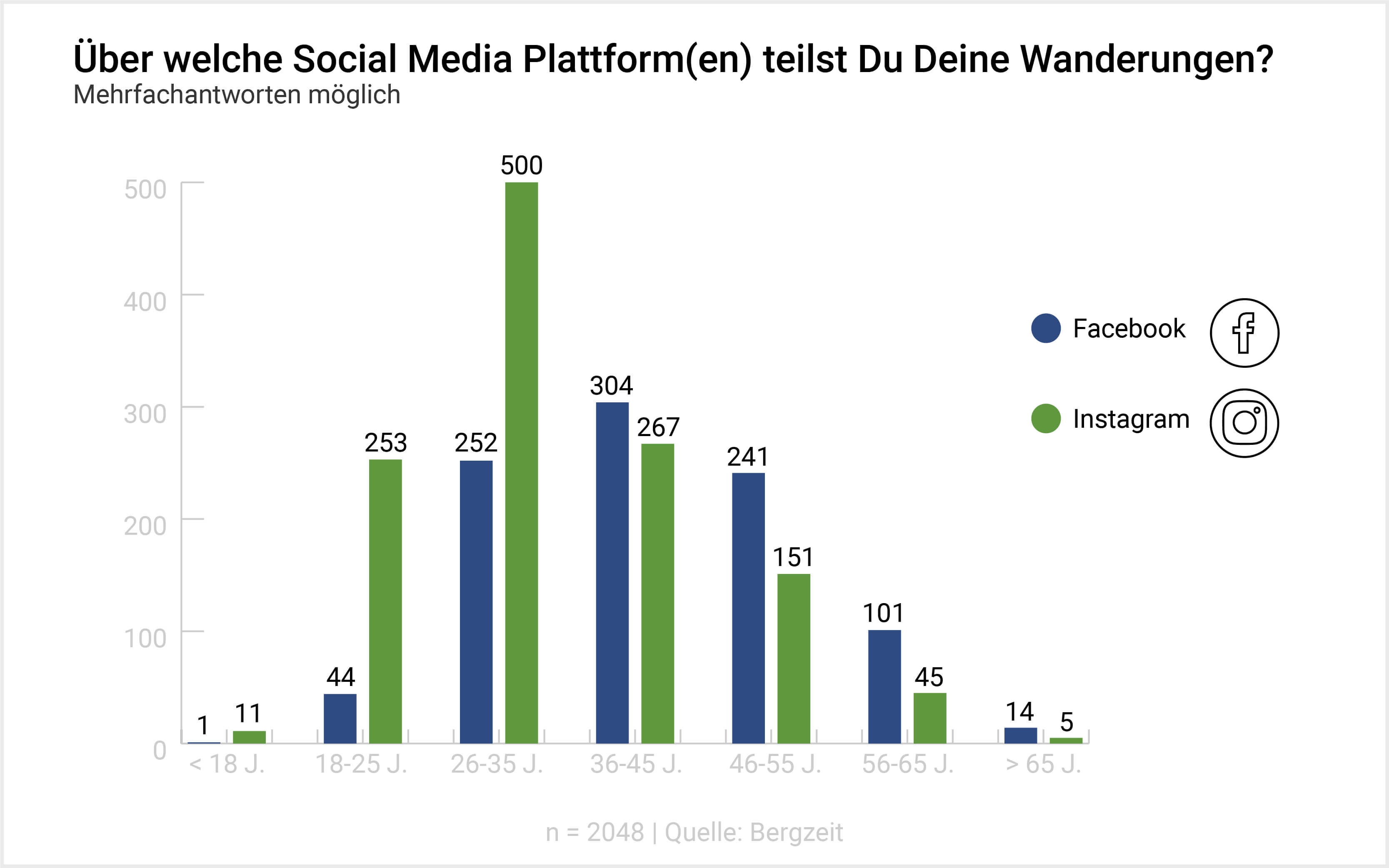 Ebenfalls wird klar: Facebook wird für Generation Y und Z immer irrelevanter. Nur 11 % der 18- bis 25-Jährigen und 26 % der 26- bis 35-Jährigen teilen ihre Wanderungen über Facebook. Doch Facebook wird noch genutzt! Und zwar vermehrt von der Generation 36+. Ganz klarer Facebook-Junkie ist dabei die Altersgruppe 56 bis 65 Jahre.