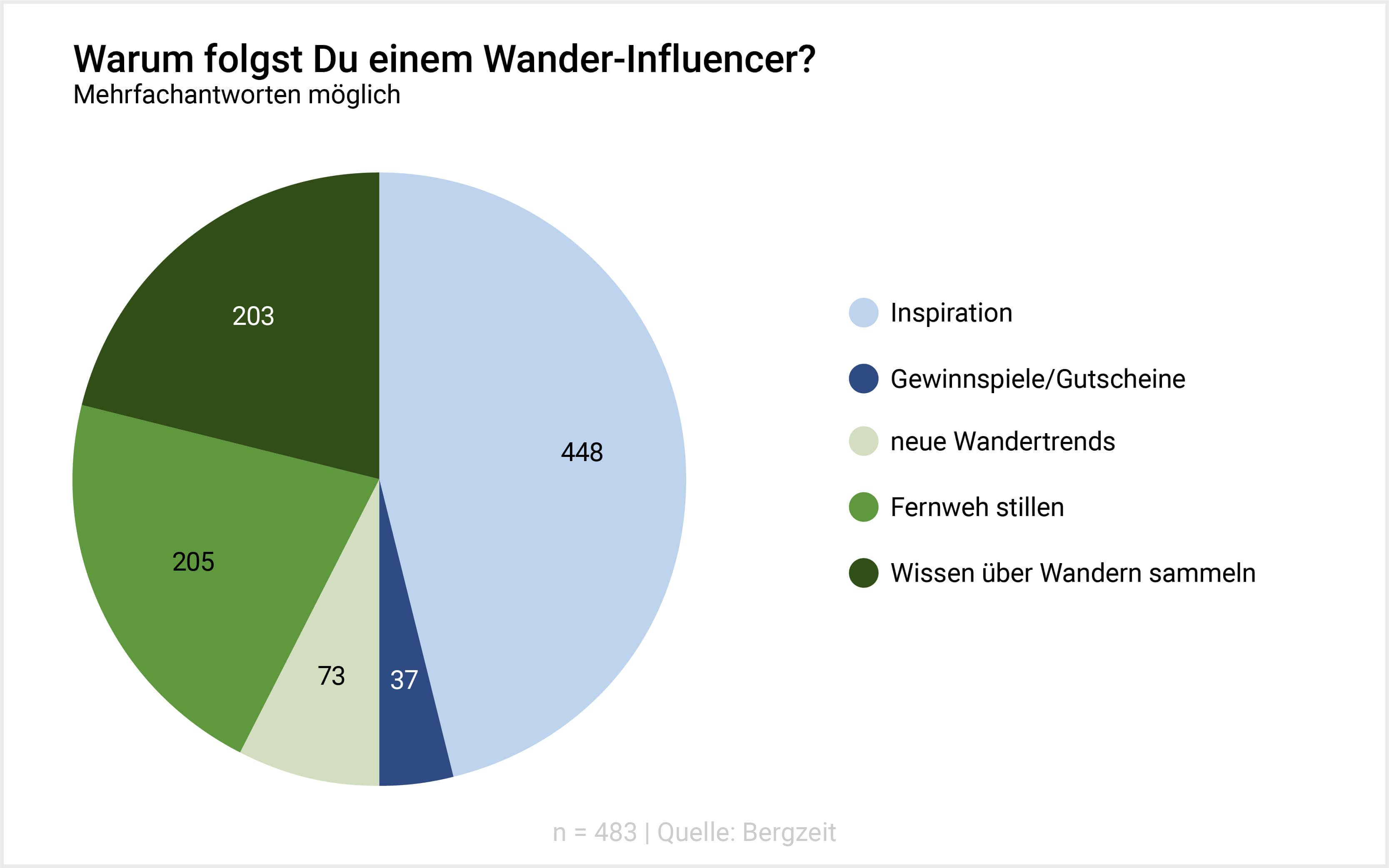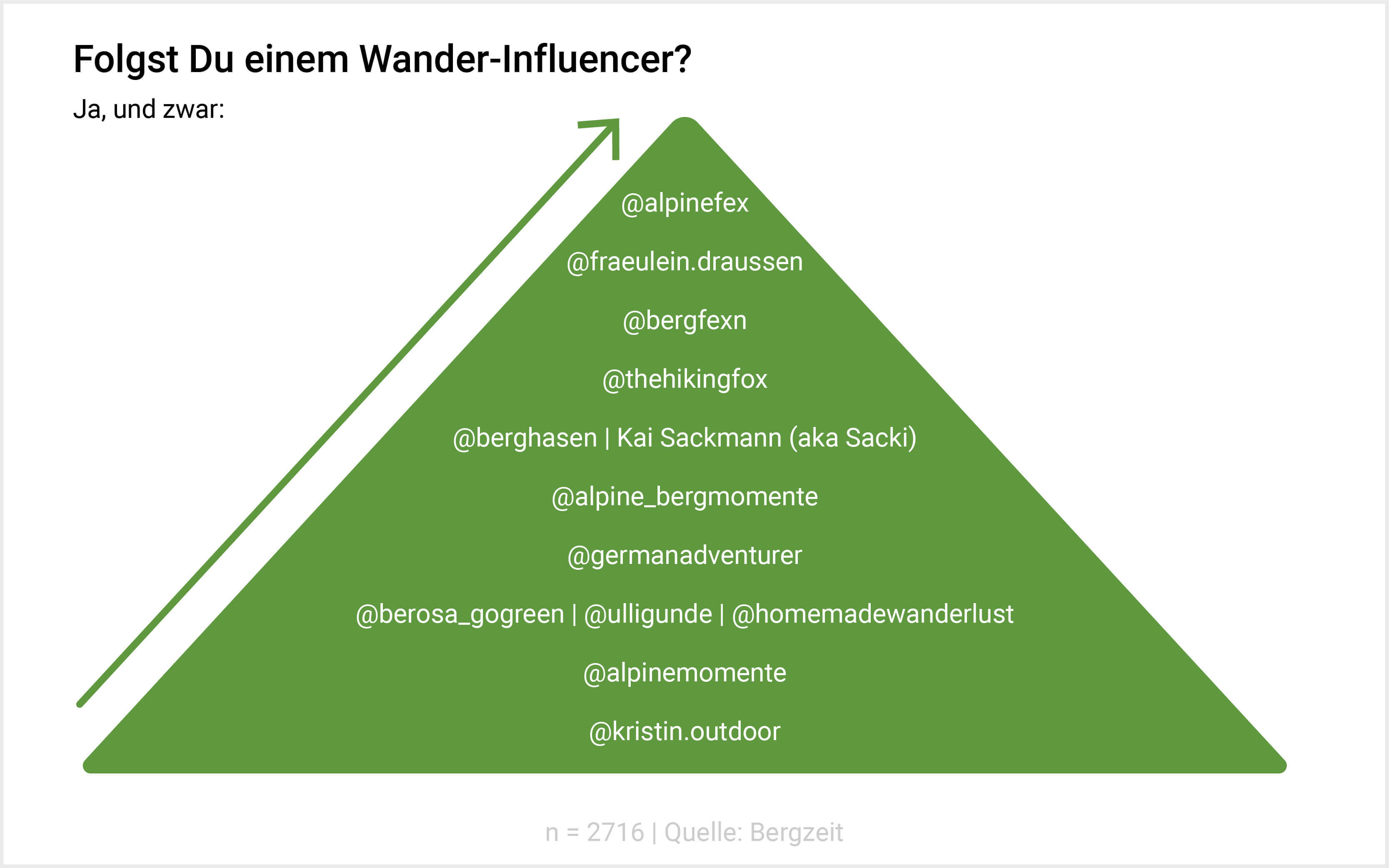 17,9 % der Befragten gaben an, dass sie einem Wander-Influencer folgen. Dabei nannten sie unter den Top 10 vor allem Instagramer wie @alpinefex (Platz 1), @fraeulein.draussen (Platz 2) oder @bergfexn (Platz 3). Aber auch YouTuber wurden mit Kai Sackmann (aka. Sacki) und Alpine Momente (auch auf Instagram @alpinemomente) unter die Top 10 gewählt.