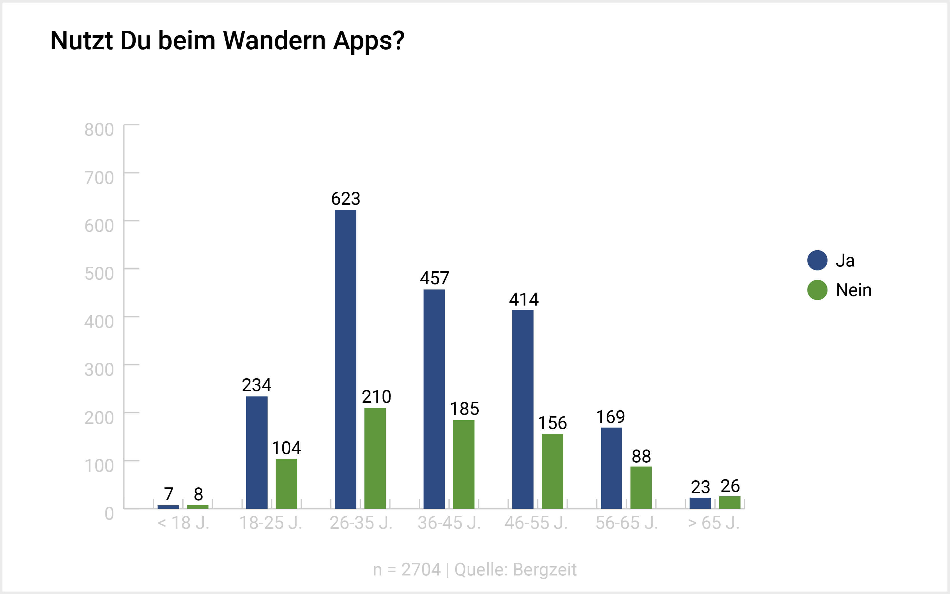 71,3 % der Befragten nutzen Wander-Apps – und zwar durchweg in allen Altersgruppen. Heavy User sind die drei Altersgruppen von 26 bis 55 Jahren, bei denen im Schnitt über 70 % der Befragten angab, sich durch Wander-Apps Unterstützung zu holen. Überraschend: Auch die über 65-Jährigen sind digital gut aufgestellt. Hier nutzen 47 % der Befragten Wander-Apps für ihre Erlebnisse. Die Digitalisierung ist also aus dem Wandersport nicht mehr wegzudenken.