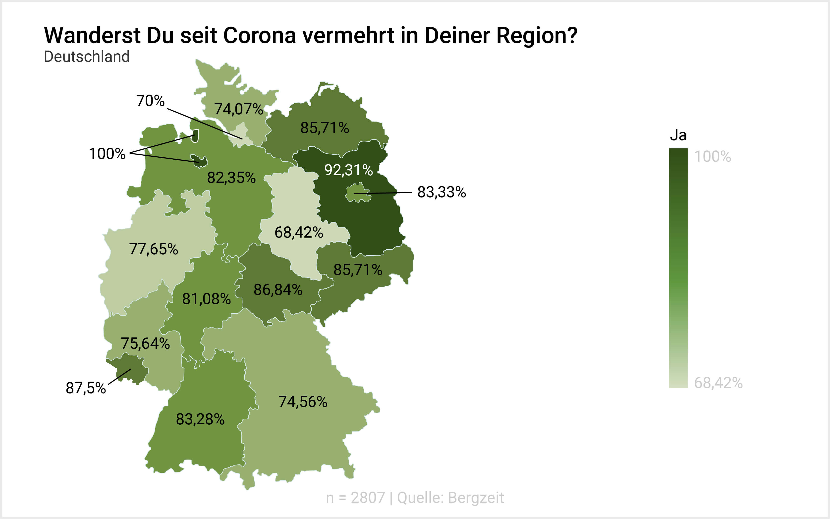 - Deutschland: Vor allem die Bremer und Brandenburger bleiben beim Wandern in ihren Gefilden. Bewohner der Bundesländer Bayern, Hamburg und Sachsen-Anhalt gaben seltener an, vermehrt in ihrer Region unterwegs zu sein. Sie suchen sich ihre Wanderrouten eher unabhängig von der Region aus.