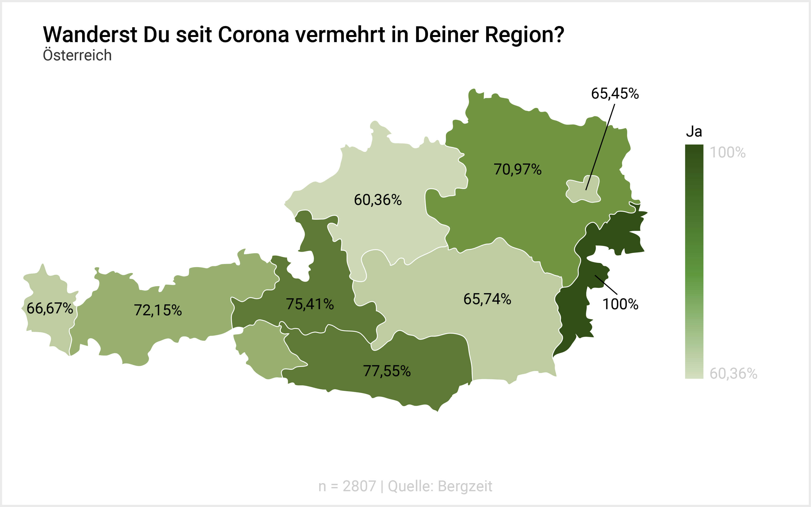 - Österreich: Hier gaben vor allem Befragte aus den Bundesländern Burgenland, Kärnten und Salzburg an, beim Wandern vorrangig in ihrer Region auf Tour zu gehen.