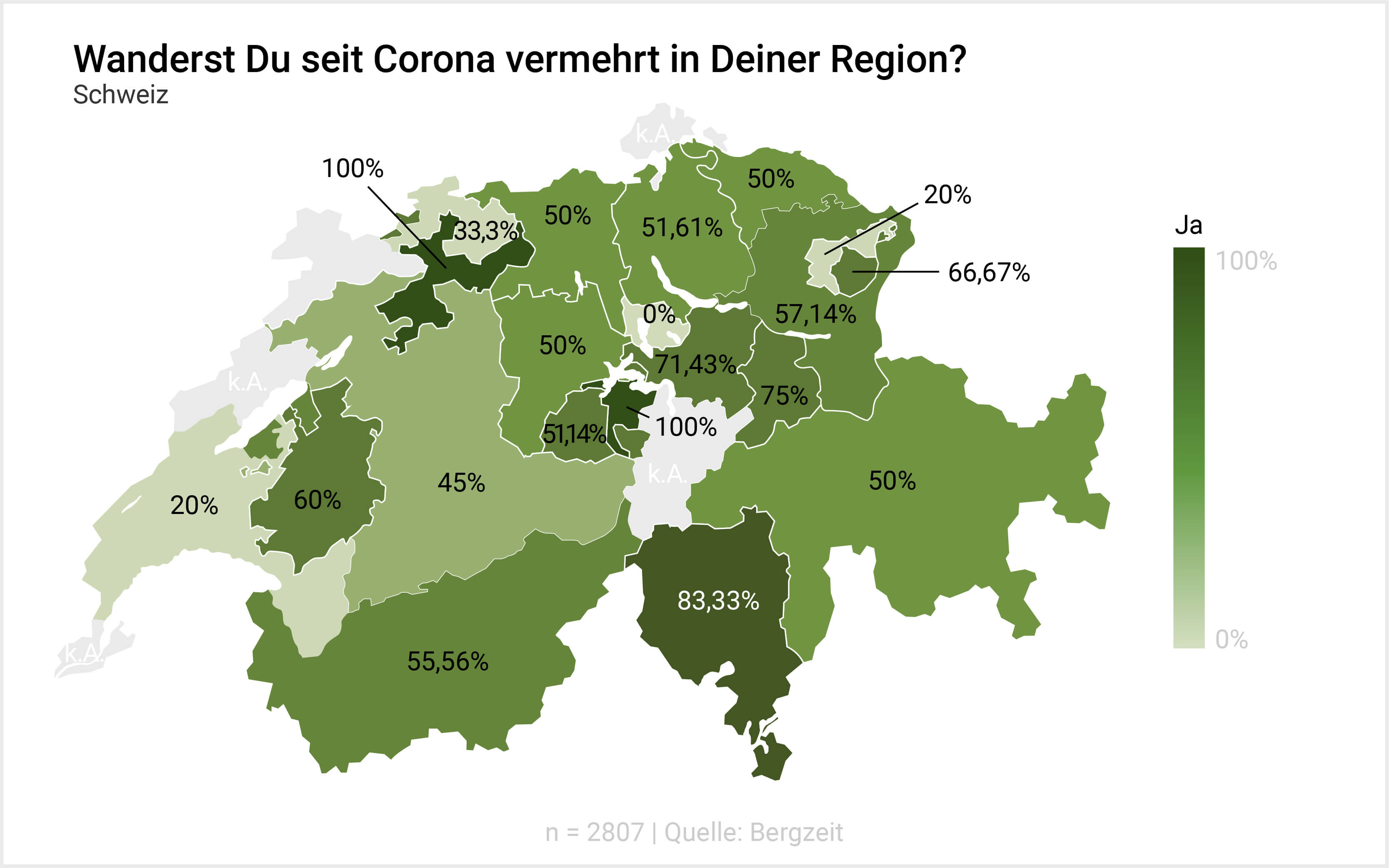 - Schweiz: Hier gaben vor allem die Wandernden aus den Kantons Nidwalden, Solothurn, Tessin, Glarus und Schwyz an, vermehrt in ihrer Umgebung zu wandern.